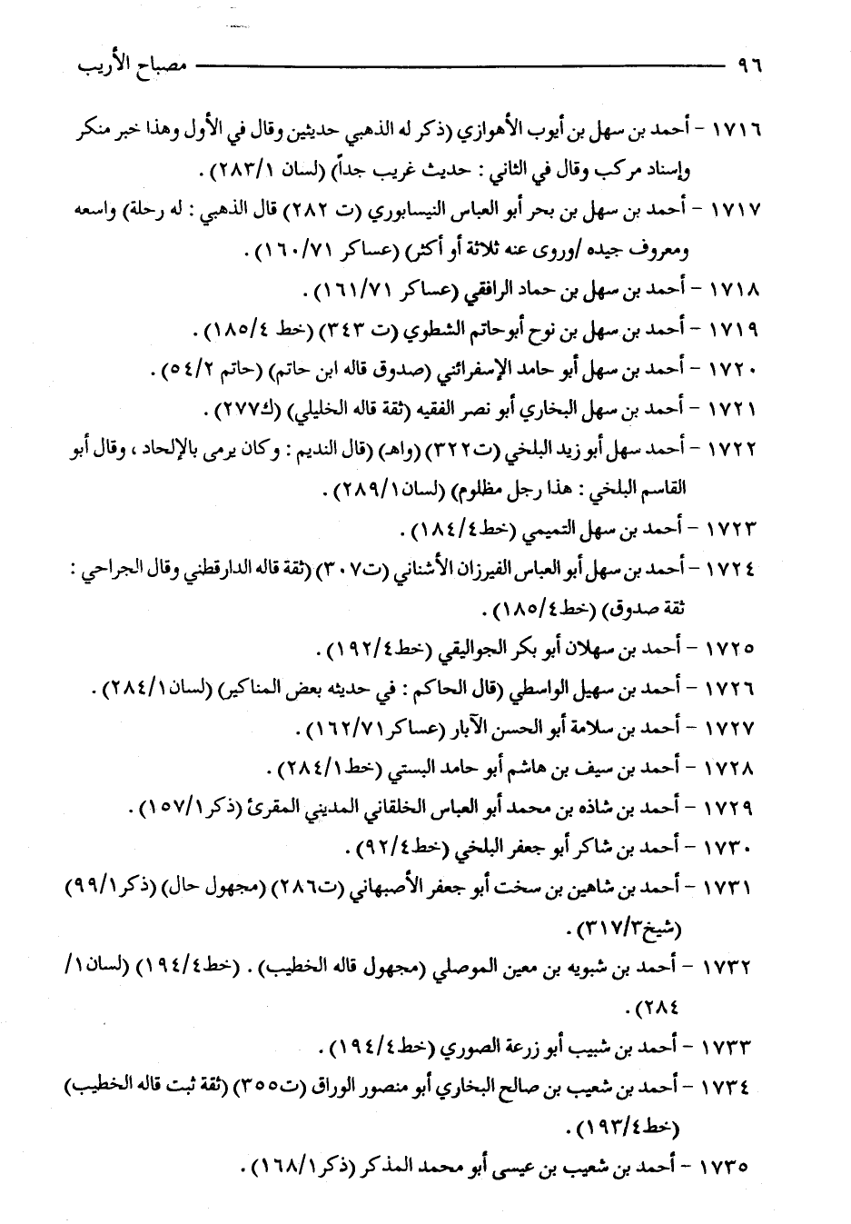 1716 - أحمد بن سهل بن أيوب الأهوازي (ذكر له الذهبي حديثين وقال في الأول وهذا خبر منكر وإسناد مركب وقال في الثاني: حديث غريب جدًّا) (لسان 1/ 283).