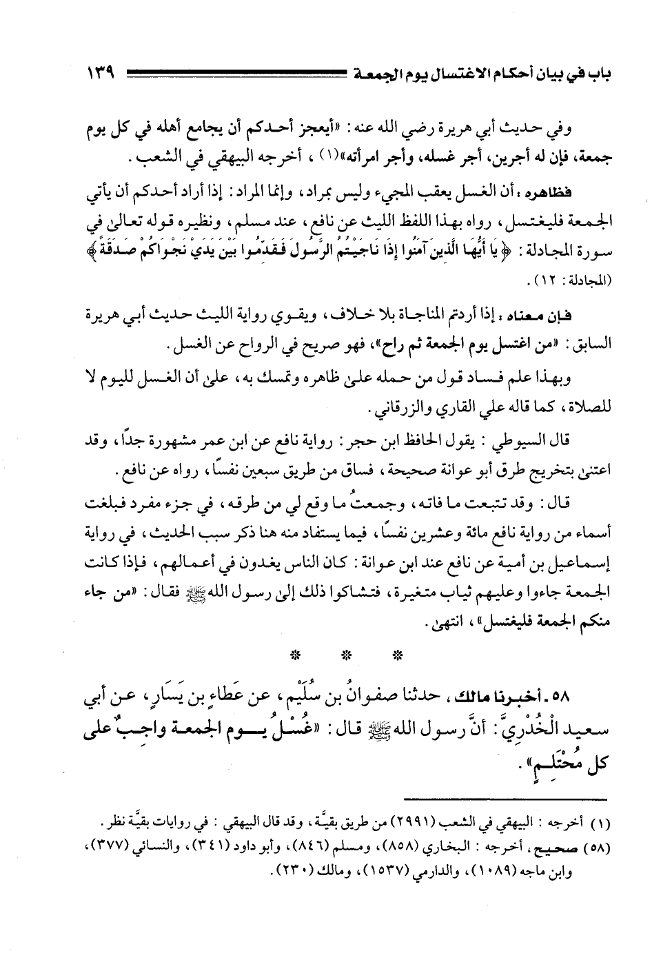 58 - أخبرنا مالك، حدثنا صفوانُ بن سُلَيْم، عن عَطاءٍ بن يَسَارٍ، عن أبي سعيد الْخُدْرِيَّ: أنَّ رسول الله - صلى الله عليه وسلم - قال: "غُسْلُ يوم الجمعة واجِبٌ على كل مُحْتَلِمٍ".