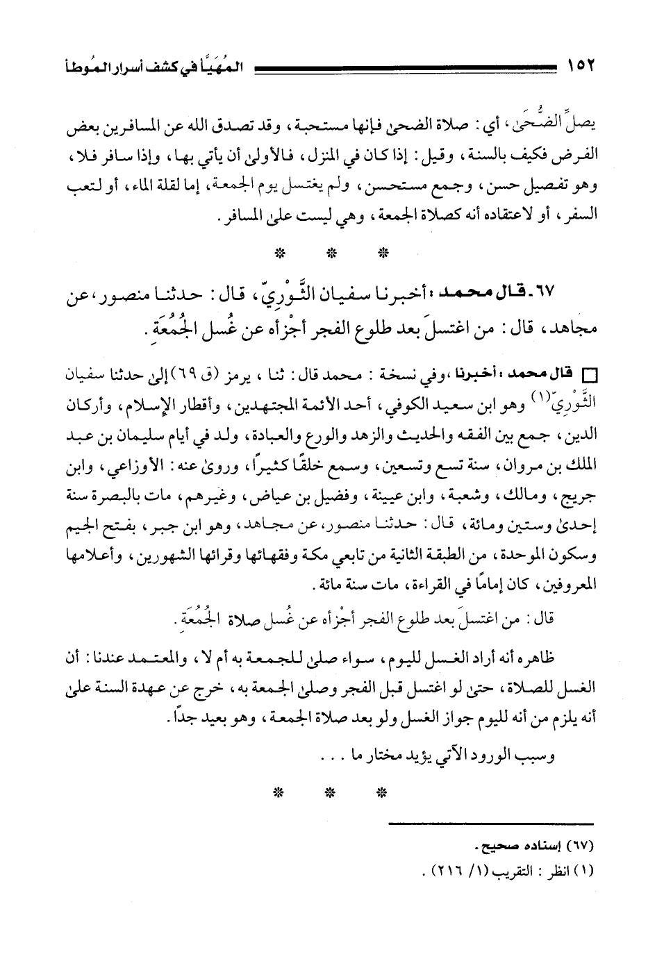 67 - قال محمد: أخبرنا سفيان الثَّوْرِيّ، قال: حدثنا منصور، عن مجاهد، قال: من اغتسلَ بعد طلوع الفجر أجْزأه عن غُسل الجُمُعَةِ.