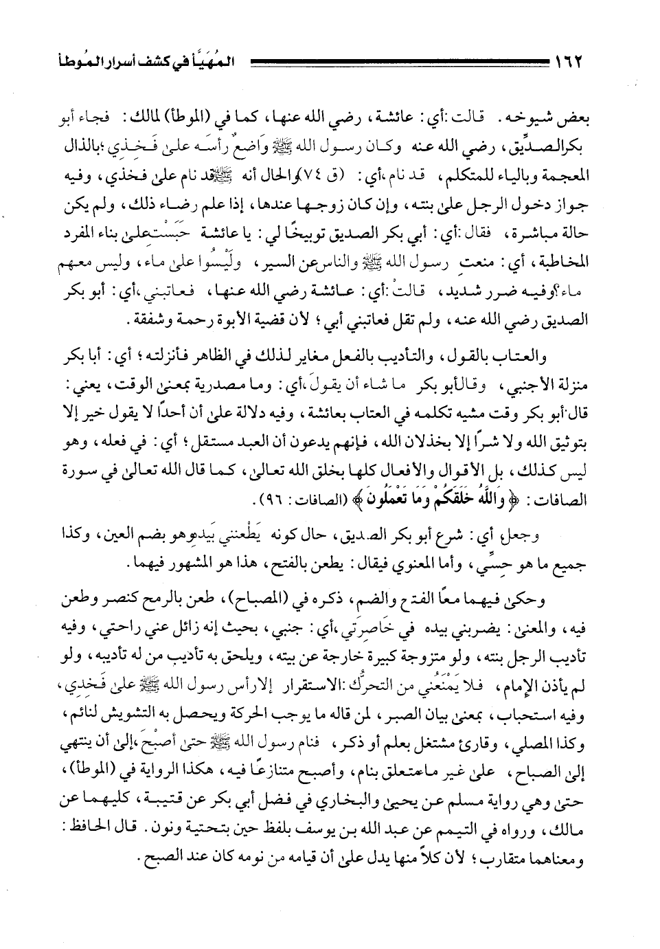 وحكى فيهما معًا الفتح والضمِ، ذكره في (المصباح)، طعن بالرمح كنصر وطعن فيه، والمعنى: يضربني بيده في خَاصِرَتي، أي: جنبي، بحيث إنه زائل عني راحتي، وفيه تأديب الرجل بنته، ولو متزوجة كبيرة خارجة عن بيته، ويلحق به تأديب من له تأديبه، ولو لم يأذن الإِمام، فلا يَمنَعُني من التحرُّك: الاستقرار إلا رأس رسول الله - صلى الله عليه وسلم - على فَخِذِي، وفيه استحباب، بمعنى بيان الصبر، لمن قاله ما يوجب الحركة ويحصل به التشويش لنائم، وكذا المصلي، وقارئ مشتغل بعلم أو ذكر، فنام رسول الله - صلى الله عليه وسلم - حتى أصْبحَ، إلى أن ينتهي إلى الصباح، على غير ماء متعلق بنام، وأصبح متنازعًا فيه، هكذا الرواية في (الموطأ)، حتى وهي رواية مسلم عن يحيى والبخاري في فضل أبي بكر عن قتيبة، كليهما عن مالك، ورواه في التيمم عن عبد الله بن يوسف بلفظ حين بتحتية ونون. قال الحافظ: ومعناهما متقارب؛ لأن كلًا منها يدل على أن قيامه من نومه كان عند الصبح.