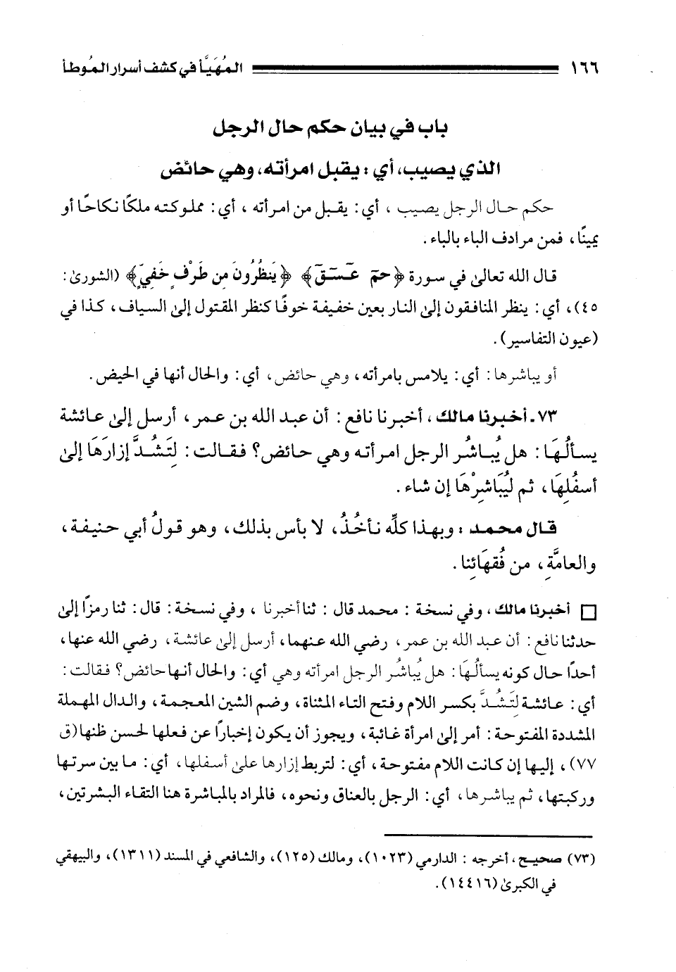 73 - أخبرنا مالك، أخبرنا نافع: أن عبد الله بن عمر، أرسل إلى عائشة يسألُهَا: هل يُباشرُ الرجل امرأته وهي حائض؟ فقالت: لِتَشُدَّ إزارَهَا إلى أسفُلِهَا، ثم ليُبَاشِرْهَا إن شاء.