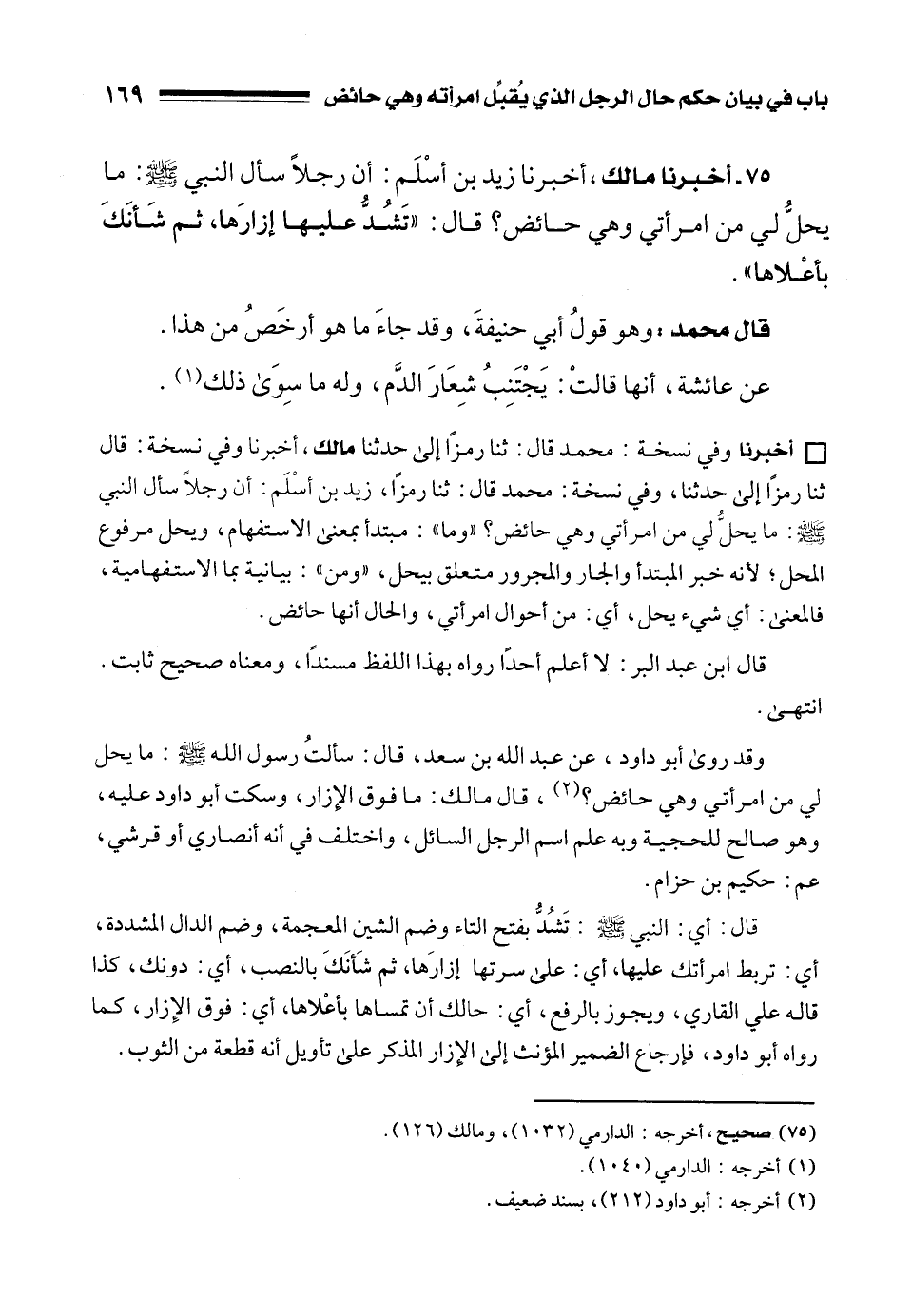 75 - أخبرنا مالك، أخبرنا زيد بن أسْلَم: أن رجلًا سأل النبي - صلى الله عليه وسلم -: ما يحلُّ لي من امرأتي وهي حائض؟ قال: "تَشُدُّ عليها إزارَها، ثم شَأنَكَ بأعْلاها".