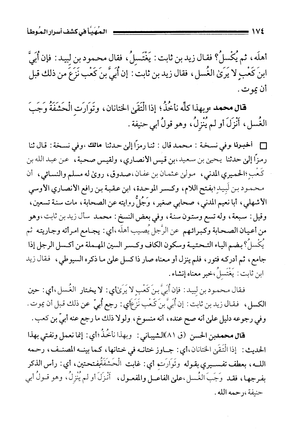 • أخبرنا وفي نسخة: محمد قال: ثنا رمزًا إلى حدثنا مالك، وفي نسخة: قال ثنا رمزًا إلى حدثنا يحيى بن سعيد، بن قيس الأنصاري، ولقيس صحبة، عن عبد الله بن كَعْبٍ؛ الحميري المدني، مولى عثمان بن عفان، صدوق، روى له مسلم والنسائي، أن محمود بن لَبِيدٍ؛ بفتح اللام، وكسر الموحدة، ابن عقبة بن رافع الأنصاري الأوسي الأشهلي، أبا نعيم المدني، صحابي صغير، وَجُلُّ روايته عن الصحابة، مات سنة تسعين، وقيل: سبعة، وله تسع وستون سنة، وفي بعض النسخ: محمد سأل زيد بن ثابت، وهو من أعيان الصحابة وكبرائهم عن الرَّجل يُصيب أهلَه، أي: يجامع امرأته وجاريته ثم يُكْسلُ؟ بضم الياء التحتية وسكون الكاف وكسر السين المهملة من أكسل الرجل إذا جامع، ثم أدركه فتور، فلم ينزل أو معناه صار ذا كسل على ما ذكره السيوطي، فقال زيد بن ثابت: يَغتَسِلُ، خبر معناه إنشاء.