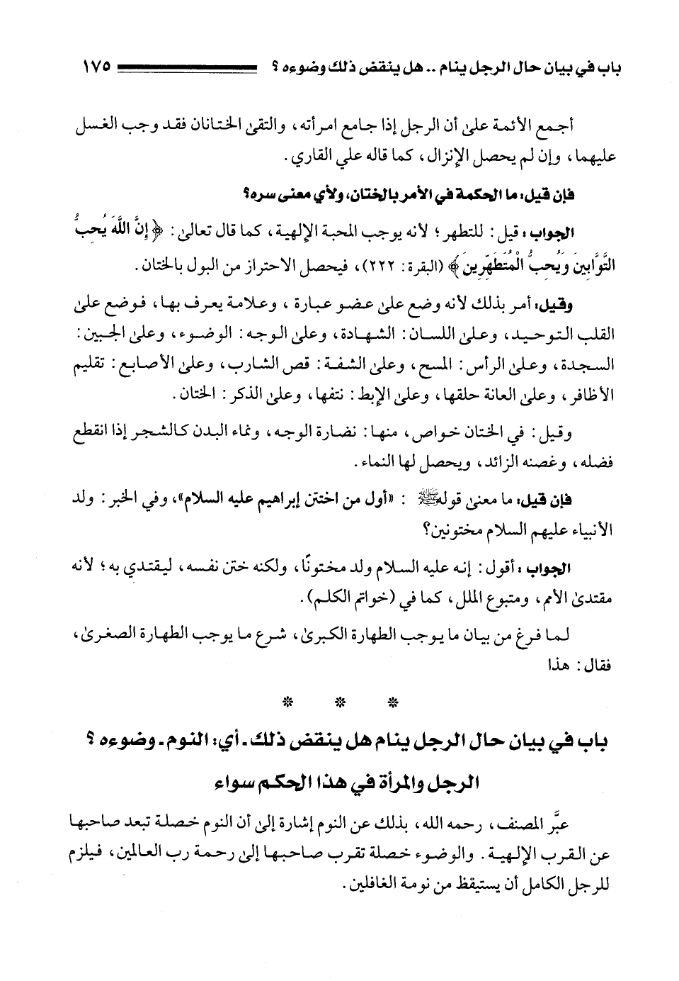 عبَّر المصنف، رحمه الله، بذلك عن النوم إشارة إلى أن النوم خصلة تبعد صاحبها عن القرب الإلهية. والوضوء خصلة تقرب صاحبها إلى رحمة رب العالمين، فيلزم للرجل الكامل أن يستيقظ من نومة الغافلين.