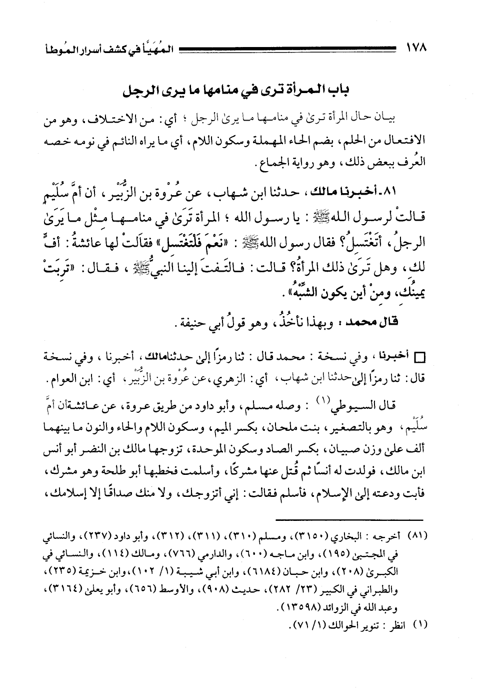 81 - أخبرنا مالك، حدثنا ابن شهاب، عن عُرْوة بن الزُّبَيْر، أن أمَ سُلَيْمٍ قالتْ لرسول الله - صلى الله عليه وسلم -: يا رسول الله؛ المرأة تَرَى في منامها مِثْل ما يَرَى الرجلُ، أتَغْتَسِلُ؟ فقال رسول الله - صلى الله عليه وسلم -: "نَعَمْ فَلتَغْتَسِل" فقالَتْ لها عائشةُ: أفٍّ لكِ، وهل تَرَى ذلك المرأةُ؟ قالت: فالتَفتَ إلينا النبيُّ - صلى الله عليه وسلم -، فقال: "تَرِبَتْ يمينُكِ، ومِنْ أين يكون الشِّبْهُ".