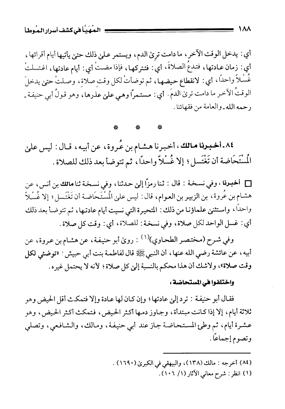 • أخبرنا، وفي نسخة: قال: ثنا رمزًا إلى حدثنا، وفي نسخة ثنا مالك بن أنس، عن هشام بن عُروة، بن الزبير بن العوام، قال: ليس على المُسْتَحَاضة أن تَغْتَسل؛ إلا غُسْلًا واحدًا، واستثنى علماؤنا من ذلك: المتحيرة التي نسيت أيام عادتها، ثم تتوضأ بعد ذلك أي: غسل الواحد لكل صلاة، وفي نسخة: للصلاة، أي: وقت كل صلاة.