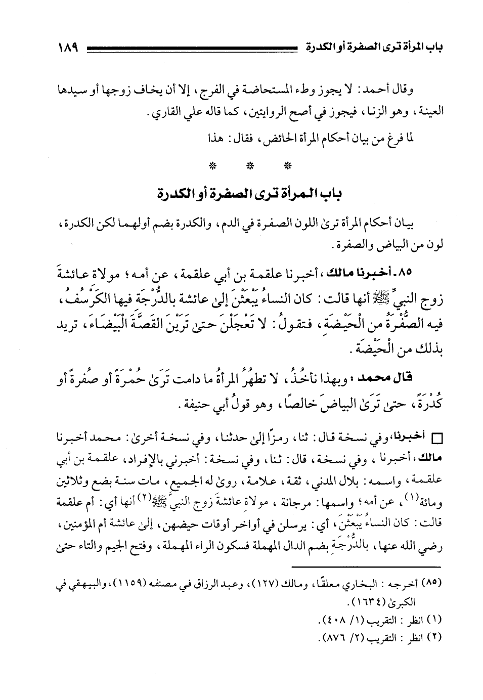 85 - أخبرنا مالك، أخبرنا علقمة بن أبي علقمة، عن أمه؛ مولاةِ عائشةَ زوج النبيِّ - صلى الله عليه وسلم - أنها قالت: كان النساءُ يَبْعَثْنَ إلى عائشة بالدُّرْجَة فيها الكَرْسُفُ، فيه الصُّفْرَةُ من الْحَيْضَةِ، فتقولُ: لا تَعْجَلْنَ حتى تَرَيْنَ القَصَّةَ الْبَيْضَاءَ، تريد بذلك من الْحَيْضَة.