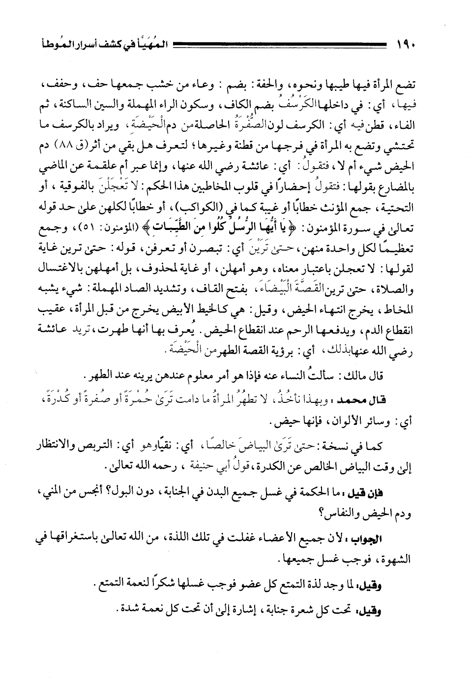 تضع المرأة فيها طيبها ونحوه، والحفة: بضم: وعاء من خشب جمعها حف، وحفف، فيها، أي: في داخلها الكَرْسُفُ بضم الكاف، وسكون الراء المهملة والسين الساكنة، ثم الفاء، قطن فيه أي: الكرسف لون الصُّفْرَةُ الحاصلة من دم الْحَيْضَةِ، ويراد بالكرسف ما تحتشي وتضع به المرأة في فرجها من قطنة وغيرها؛ لتعرف هل بقي من أثر (ق 88) دم الحيض شيء أم لا، فتقولُ: أي: عائشة رضي الله عنها، وإنما عبر أم علقمة عن الماضي بالمضارع بقولها: فتقولُ إحضارًا في قلوب المخاطبين هذا الحكم: لا تَعْجَلْنَ بالفوقية، أو التحتية، جمع المؤنث خطابًا أو غيبة كما في (الكواكب)، أو خطابًا لكلهن على حد قوله تعالى في سورة المؤمنون: {يَاأَيُّهَا الرُّسُلُ كُلُوا مِنَ الطَّيِّبَاتِ} [المؤمنون: 51]، وجمع تعظيمًا لكل واحدة منهن، حتى تَرَيْنَ أي: تبصرن أو تعرفن، قوله: حتى ترين غاية لقولها: لا تعجلن باعتبار معناه، وهو أمهلن، أو غاية لمحذوف، بل أمهلهن بالاغتسال والصلاة، حتى ترين القَصَّةَ الْبَيْضَاءَ، بفتح القاف، وتشديد الصاد المهملة: شيء يشبه المخاط، يخرج انتهاء الحيض، وقيل: هي كالخيط الأبيض يخرج من قبل المرأة، عقيب انقطاع الدم، ويدفعها الرحم عند انقطاع الحيض. يُعرف بها أنها طهرت، تريد عائشة رضي الله عنها بذلك، أي: برؤية القصة الطهر من الْحَيْضَة.
