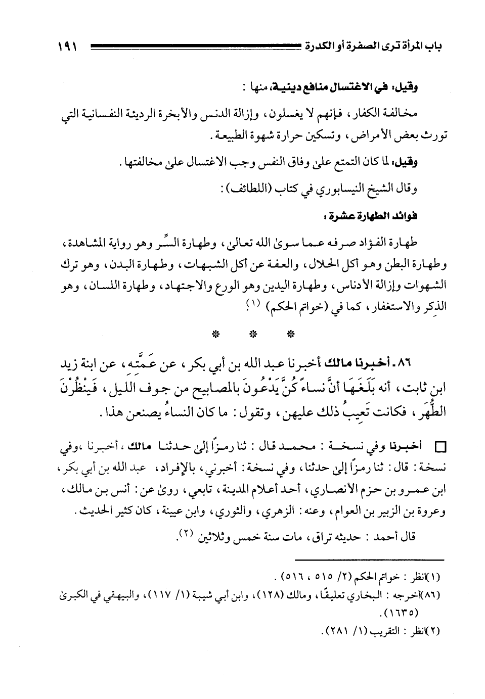86 - أخبرنا مالك أخبرنا عبد الله بن أبي بكر، عن عَمَّتِهِ، عن ابنة زيد بن ثابت، أنه بَلَغَهَا أنَّ نساءً كُنَّ يَدْعُونَ بالمصابيح من جوف الليل، فَينْظُرْنَ الطُّهرَ، فكانت تَعِيبُ ذلك عليهن، وتقول: ما كان النساءُ يصنعن هذا.