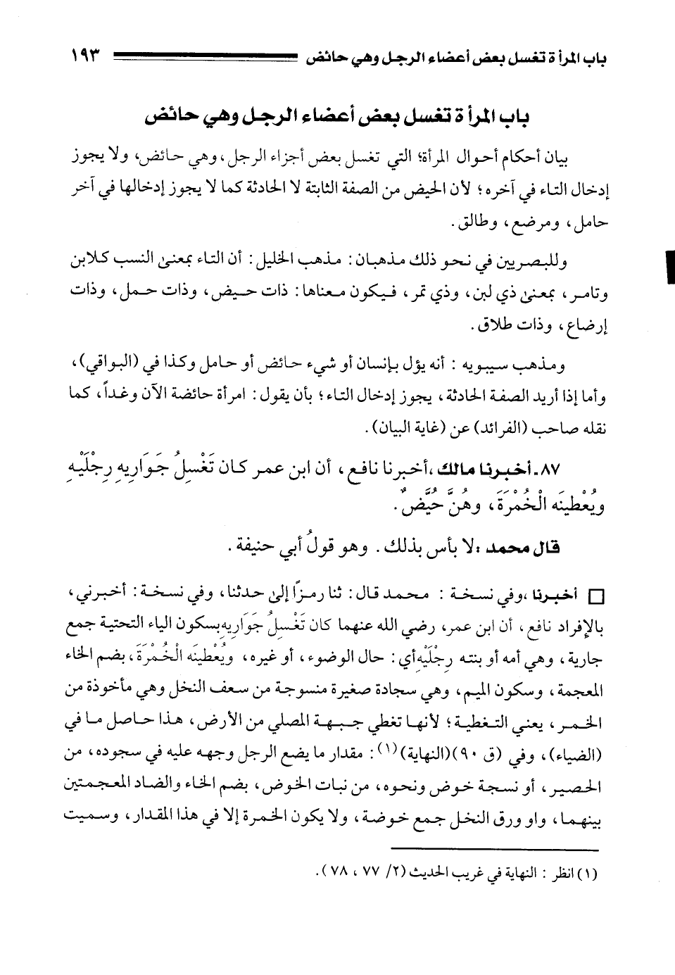 87 - أخبرنا مالك، أخبرنا نافع، أن ابن عمر كان تَغْسِلُ جَوَارِيهِ رِجْلَيْهِ ويُعْطينَه الْخُمْرَةَ، وهنَّ حُيَّضٌ.