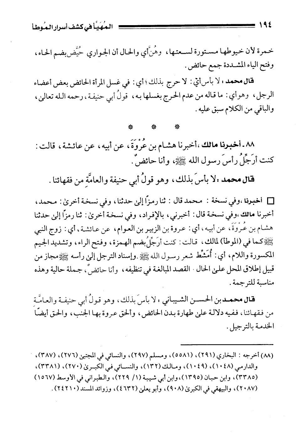 88 - أخبرنا مالك، أخبرنا هشام بن عُرْوَةَ، عن أبيه، عن عائشة، قالت: كنت أرَجِّلُ رأسَ رسول الله - صلى الله عليه وسلم -، وأنا حائضٌ.