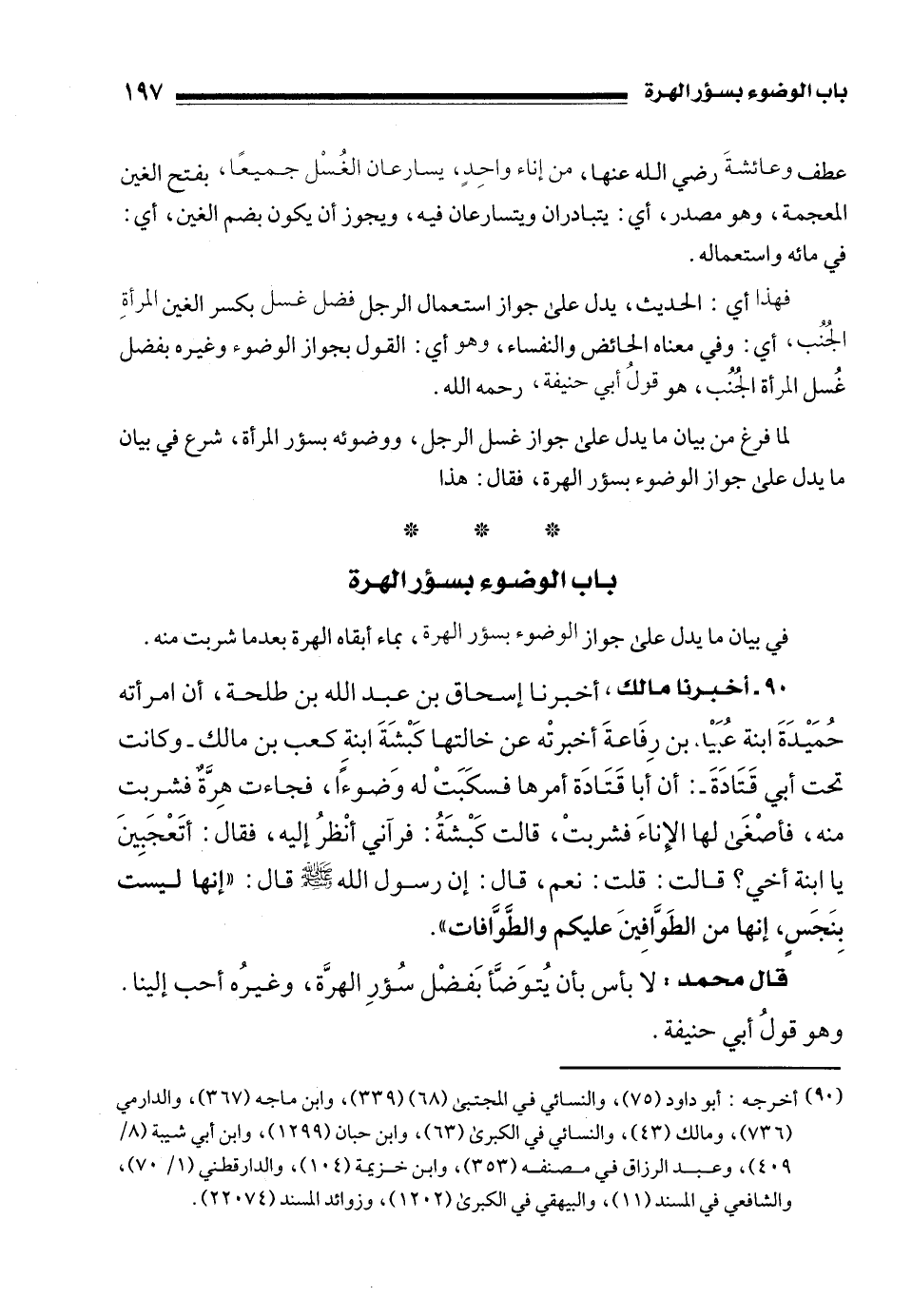 90 - أخبرنا مالك، أخبرنا إسحاق بن عبد الله بن طلحة، أن امرأته حُمَيْدَةَ ابنة عُبَيْد بن رِفَاعةَ أخبرتْه عن خالتها كَبْشَةَ ابنةِ كعب بن مالك - وكانت تحت أبي قَتَادَةَ -: أن أبا قَتَادَة أمرها فسكَبَتْ له وَضوءًا، فجاءت هِرَّةٌ فشربت منه، فأصْغَى لها الإِناءَ فشربتْ، قالت كَبْشَةُ: فرآني أنْظرُ إليه، فقال: أتَعْجَبِينَ يا ابنة أخي؟ قالت: قلت: نعم، قال: إن رسول الله - صلى الله عليه وسلم - قال: "إنها ليست بِنَجَسٍ، إنها من الطَوَّافِينَ عليكم والطَّوَّافات".