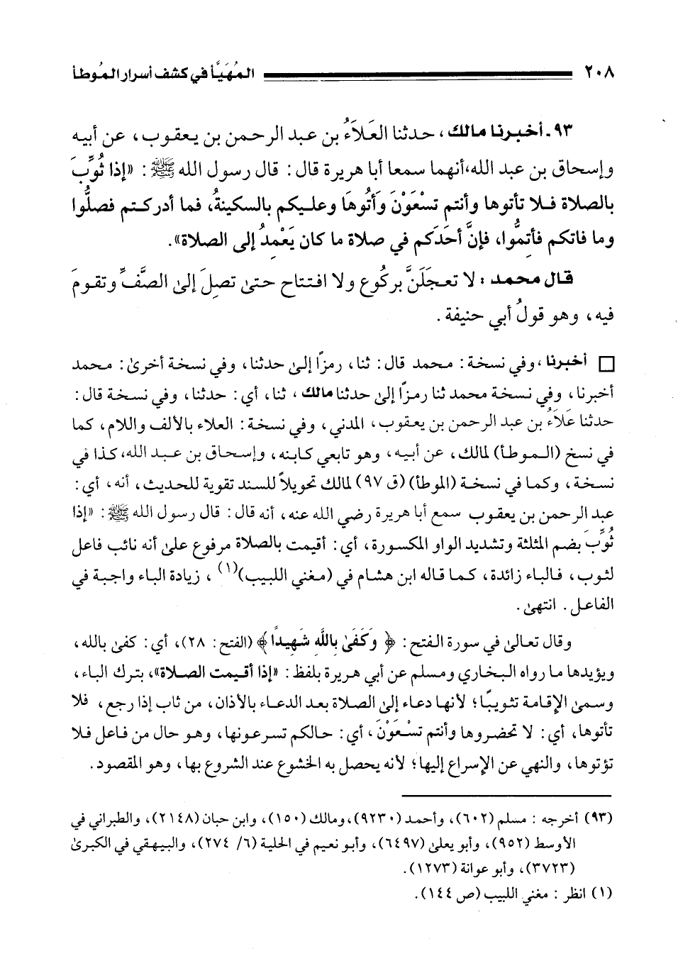 93 - أخبرنا مالك، حدثنا العَلَاءُ بن عبد الرحمن بن يعقوب، عن أبيه وإسحاق بن عبد الله، أنهما سمعا أبا هريرة قال: قال رسول الله - صلى الله عليه وسلم -: "إذا ثُوِّبَ بالصلاة فلا تأتوها وأنتم تسْعَوْنَ وَأتُوهَا وعليكم بالسكينةُ، فما أدركتم فصلُّوا وما فاتكم فأتِمُّوا، فإنَّ أحَدَكم في صلاة ما كان يَعْمِدُ إلى الصلاة".