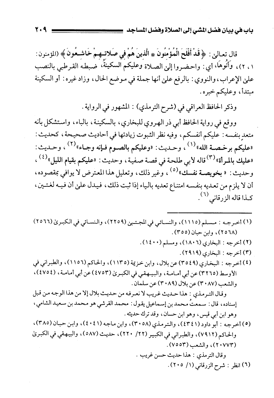 قال تعالى: {قَدْ أَفْلَحَ الْمُؤْمِنُونَ (1) الَّذِينَ هُمْ فِي صَلَاتِهِمْ خَاشِعُونَ} [المؤمنون: 1، 2]، وَأتُوهَا، أي: واحضروا إلى الصلاة وعليكم السكينةُ، ضبطه القرطبي بالنصب على الإِعراب، والنووي: بالرفع على أنها جملة في موضع الحال، وزاد غيره: أو السكينة مبتدأ، وعليكم خبره.