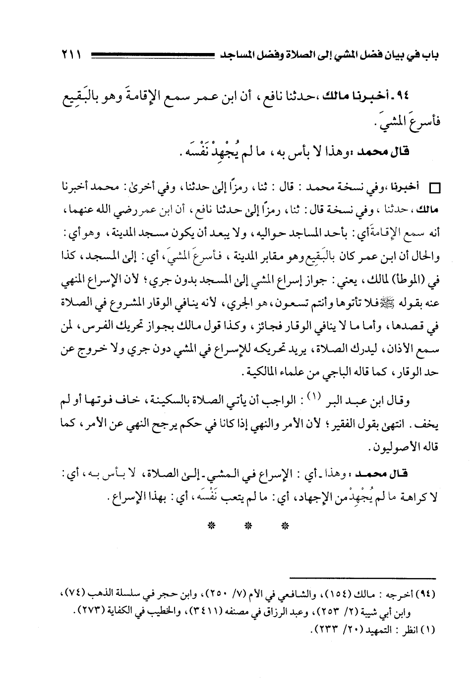 • أخبرنا، وفي نسخة محمد: قال: ثنا، رمزًا إلى حدثنا، وفي أخرى: محمد أخبرنا مالك، حدثنا، وفي نسخة قال: ثنا، رمزًا إلى حدثنا نافع، أن ابن عمر رضي الله عنهما، أنه سمع الإِقامةَ أي: بأحد المساجد حواليه، ولا يبعد أن يكون مسجد المدينة، وهو أي: والحال أن ابن عمر كان بالبَقِيع وهو مقابر المدينة، فأسرعَ المشيَ، أي: إلى المسجد، كذا في (الموطأ) لمالك، يعني: جواز إسراع المشي إلى المسجد بدون جري؛ لأن الإِسراع المنهي عنه بقوله - صلى الله عليه وسلم - فلا تأتوها وأنتم تسعون، هو الجري، لأنه ينافي الوقار المشروع في الصلاة في قصدها، وأما ما لا ينافي الوقار فجائز، وكذا قول مالك بجواز تحريك الفرس، لمن سمع الأذان، ليدرك الصلاة، يريد تحريكه للإِسراع في المشي دون جري ولا خروج عن حد الوقار، كما قاله الباجي من علماء المالكية.