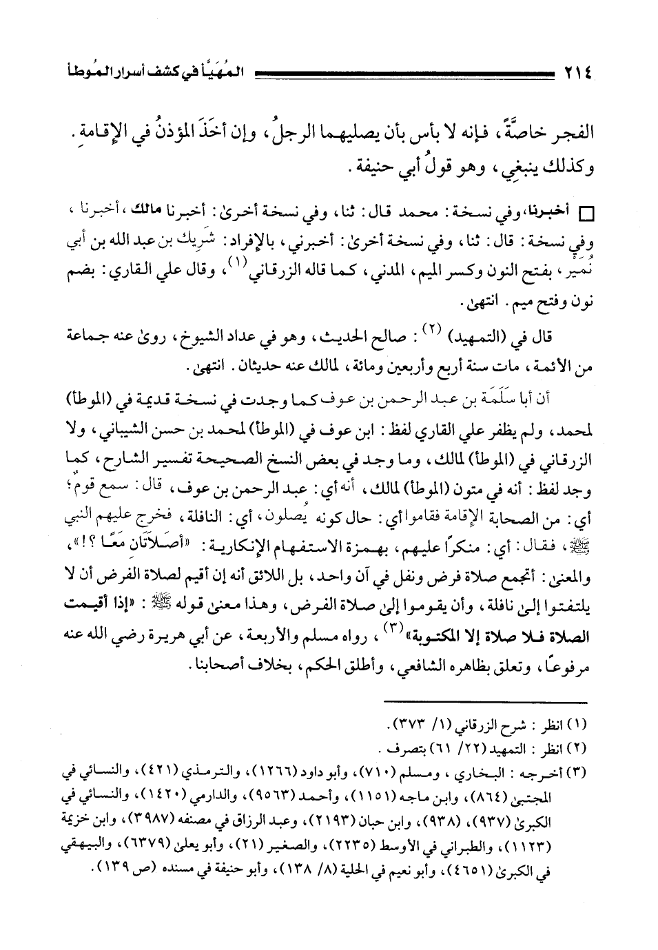 أن أبا سَلَمَة بن عبد الرحمن بن عوف كما وجدت في نسخة قديمة في (الموطأ) لمحمد، ولم يظفر علي القاري لفظ: ابن عوف في (الموطأ) لمحمد بن حسن الشيباني، ولا الزرقاني في (الموطأ) لمالك، وما وجد في بعض النسخ الصحيحة تفسير الشارح، كما وجد لفظ: أنه في متون (الموطأ) لمالك، أنه أي: عبد الرحمن بن عوف، قال: سمع قومٌ؛ أي: من الصحابة الإِقامة فقاموا أي: حال كونه يُصلون، أي: النافلة، فخرج عليهم النبي - صلى الله عليه وسلم -، فقال: أي: منكرًا عليهم، بهمزة الاستفهام الإِنكارية: "أصَلَاتَانِ مَعًا؟! "، والمعنى: أتجمع صلاة فرض ونفل في آن واحد، بل اللائق أنه إن أقيم لصلاة الفرض أن لا يلتفتوا إلى نافلة، وأن يقوموا إلى صلاة الفرض، وهذا معنى قوله - صلى الله عليه وسلم -: "إذا أقيمت الصلاة فلا صلاة إلا المكتوبة" (¬3)، رواه مسلم والأربعة، عن أبي هريرة رضي الله عنه مرفوعًا، وتعلق بظاهره الشافعي، وأطلق الحكم، بخلاف أصحابنا.
