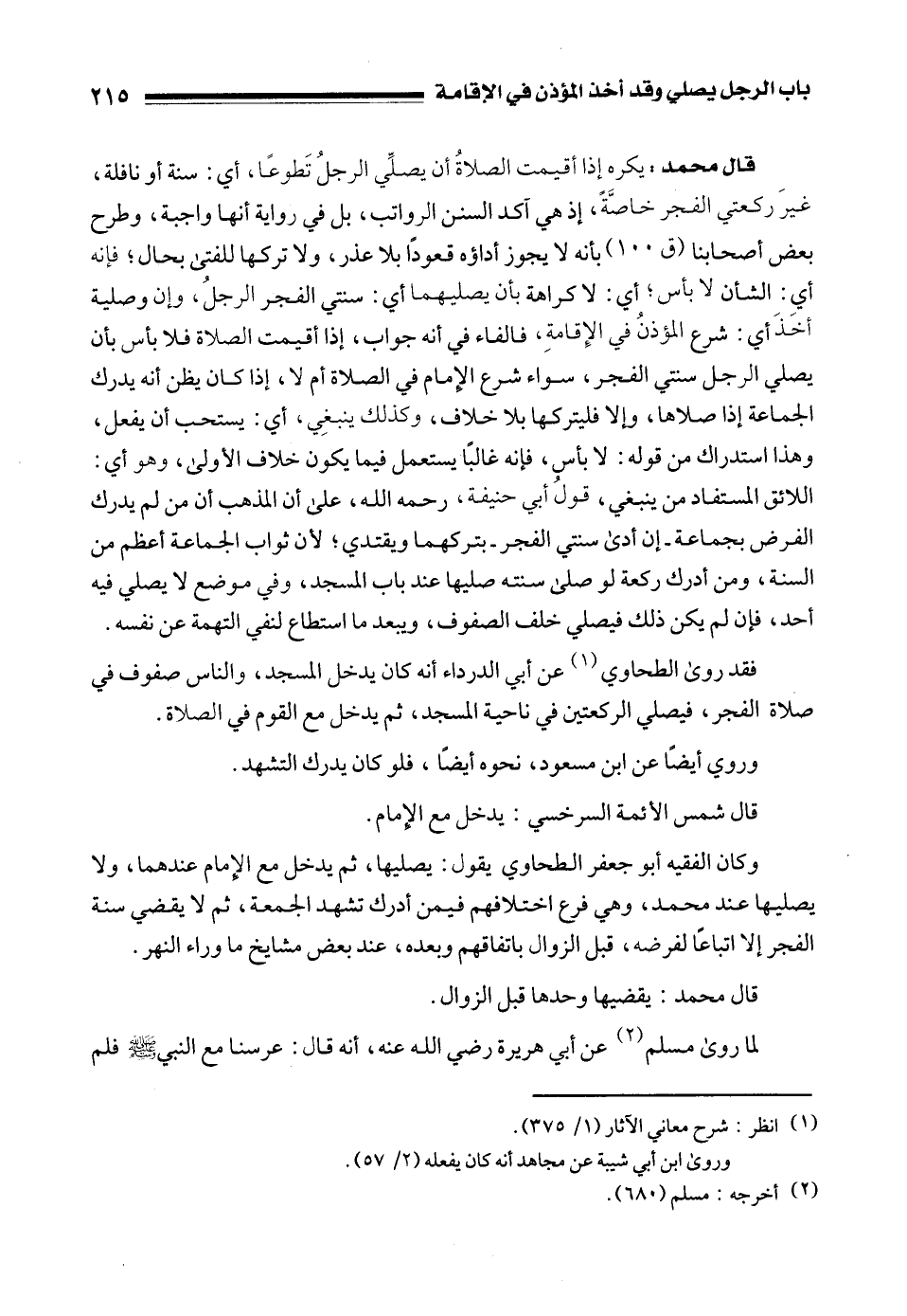 قال محمد: يكره إذا أقيمت الصلاةُ أن يصلِّي الرجلُ تَطوعًا، أي: سنة أو نافلة، غيرَ ركعتي الفجر خاصَّةً، إذ هي آكد السنن الرواتب، بل في رواية أنها واجبة، وطرح بعض أصحابنا (ق 100) بأنه لا يجوز أداؤه قعودًا بلا عذر، ولا تركها للفتى بحال؛ فإنه أي: الشأن لا بأس؛ أي: لا كراهة بأن يصليهما أي: سنتي الفجر الرجلُ، وإن وصلية أخَذَ أي: شرع المؤذنُ في الإِقامةِ، فالفاء في أنه جواب، إذا أقيمت الصلاة فلا بأس بأن يصلي الرجل سنتي الفجر، سواء شرع الإِمام في الصلاة أم لا، إذا كان يظن أنه يدرك الجماعة إذا صلاها، وإلا فليتركها بلا خلاف، وكذلك ينبغي، أي: يستحب أن يفعل، وهذا استدراك من قوله: لا بأس، فإنه غالبًا يستعمل فيما يكون خلاف الأولى، وهو أي: اللائق المستفاد من ينبغي، قولُ أبي حنيفة، رحمه الله، على أن المذهب أن من لم يدرك الفرض بجماعة - إن أدى سنتي الفجر - بتركهما ويقتدي؛ لأن ثواب الجماعة أعظم من السنة، ومن أدرك ركعة لو صلى سنته صليها عند باب المسجد، وفي موضع لا يصلي فيه أحد، فإن لم يكن ذلك فيصلي خلف الصفوف، ويبعد ما استطاع لنفي التهمة عن نفسه.