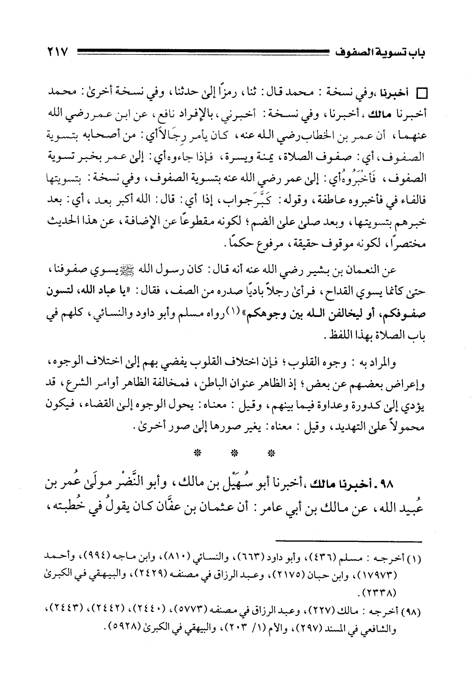 عن النعمان بن بشير رضي الله عنه أنه قال: كان رسول الله - صلى الله عليه وسلم - يسوي صفوفنا، حتى كأنما يسوي القداح، فرأى رجلًا باديًا صدره من الصف، فقال: "يا عباد الله، لتسون صفوفكم، أو ليخالفن الله بين وجوهكم" (¬1) رواه مسلم وأبو داود والنسائي، كلهم في باب الصلاة بهذا اللفظ.