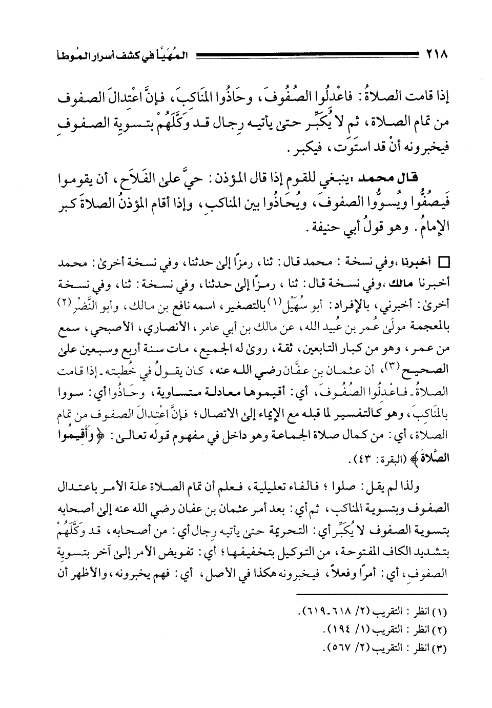 • أخبرنا، وفي نسخة: محمد قال: ثنا، رمزًا إلى حدثنا، وفي نسخة أخرى: محمد أخبرنا مالك، وفي نسخة قال: ثنا، رمزًا إلى حدثنا، وفي نسخة: ثنا، وفي نسخة أخرى: أخبرني، بالإِفراد: أبو سُهَيْل (¬1) بالتصغير، اسمه نافع بن مالك، وأبو النَّضْر (¬2) بالمعجمة مولَى عُمر بن عُبيد الله، عن مالك بن أبي عامر، الأنصاري، الأصبحي، سمع من عمر، وهو من كبار التابعين، ثقة، روى له الجميع، مات سنة أربع وسبعين على الصحيح (¬3)، أن عثمان بن عفَّان رضي الله عنه، كان يقولُ في خُطبته - إذا قامت الصلاةُ - فاعْدِلُوا الصُفُوفَ، أي: أقيموها معادلة متساوية، وحَاذُوا أي: سووا بالمنَاكِبَ، وهو كالتفسير لما قبله مع الإِيماء إلى الاتصال؛ فإنَّ اعْتدالَ الصفوف من تمام الصلاة، أي: من كمال صلاة الجماعة وهو داخل في مفهوم قوله تعالى: {وَأَقِيمُوا الصَّلَاةَ} [البقرة: 43].