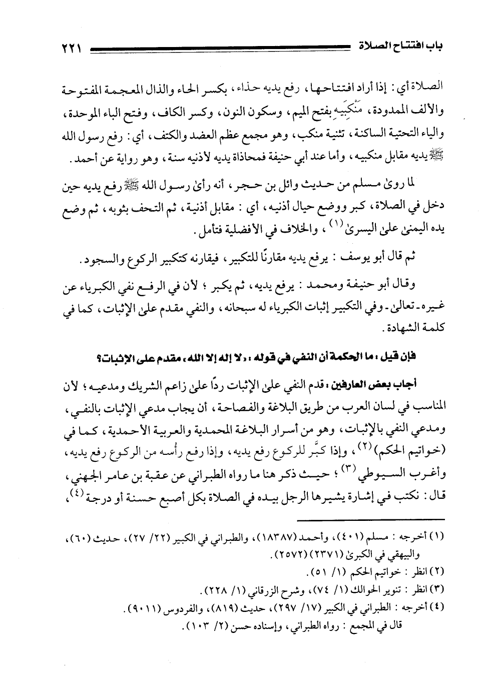 أجاب بعض العارفين: قدم النفي على الإِثبات ردًا على زاعم الشريك ومدعيه؛ لأن المناسب في لسان العرب من طريق البلاغة والفصاحة، أن يجاب مدعي الإِثبات بالنفي، ومدعي النفي بالإِثبات، وهو من أسرار البلاغة المحمدية والعربية الأحمدية، كما في (خواتيم الحكم) (¬2)، وإذا كبَّر للركوع رفع يديه، وإذا رفع رأْسه من الركوع رفع يديه، وأغرب السيوطي (¬3)؛ حيث ذكر هنا ما رواه الطبراني عن عقبة بن عامر الجهني، قال: نكتب في إشارة يشيرها الرجل بيده في الصلاة بكل أصبع حسنة أو درجة (¬4)،