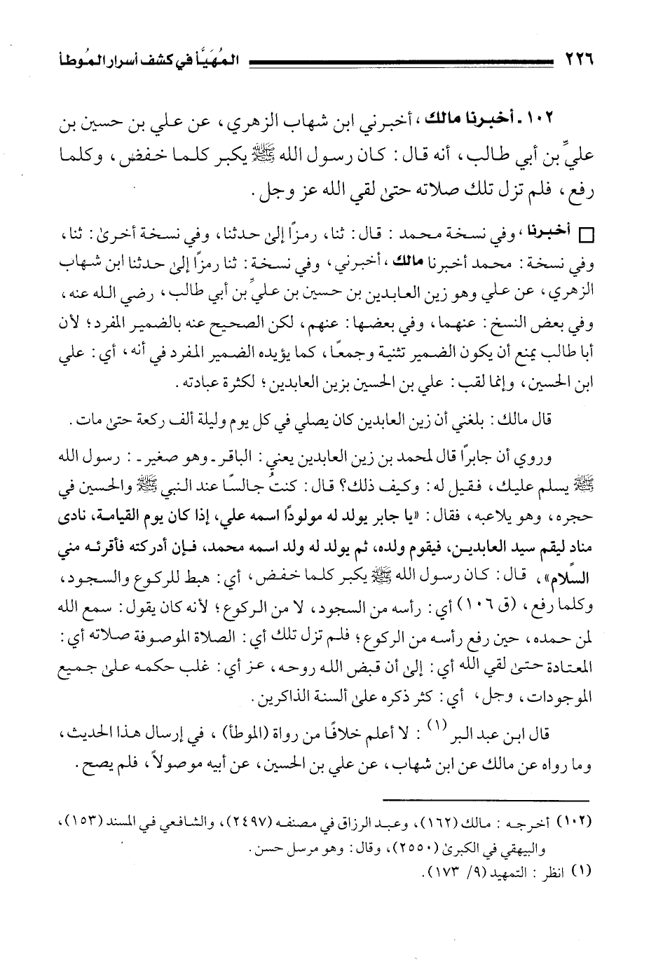 • أخبرنا، وفي نسخة محمد: قال: ثنا، رمزًا إلى حدثنا، وفي نسخة أخرى: ثنا، وفي نسخة: محمد أخبرنا مالك، أخبرني، وفي نسخة: ثنا رمزًا إلى حدثنا ابن شهاب الزهري، عن علي وهو زين العابدين بن حسين بن عليِّ بن أبي طالب، رضي الله عنه، وفي بعض النسخ: عنهما، وفي بعضها: عنهم، لكن الصحيح عنه بالضمير المفرد؛ لأن أبا طالب يمنع أن يكون الضمير تثنية وجمعًا، كما يؤيده الضمير المفرد في أنه، أي: علي بن الحسين، وإنما لقب: علي بن الحسين بزين العابدين؛ لكثرة عبادته.