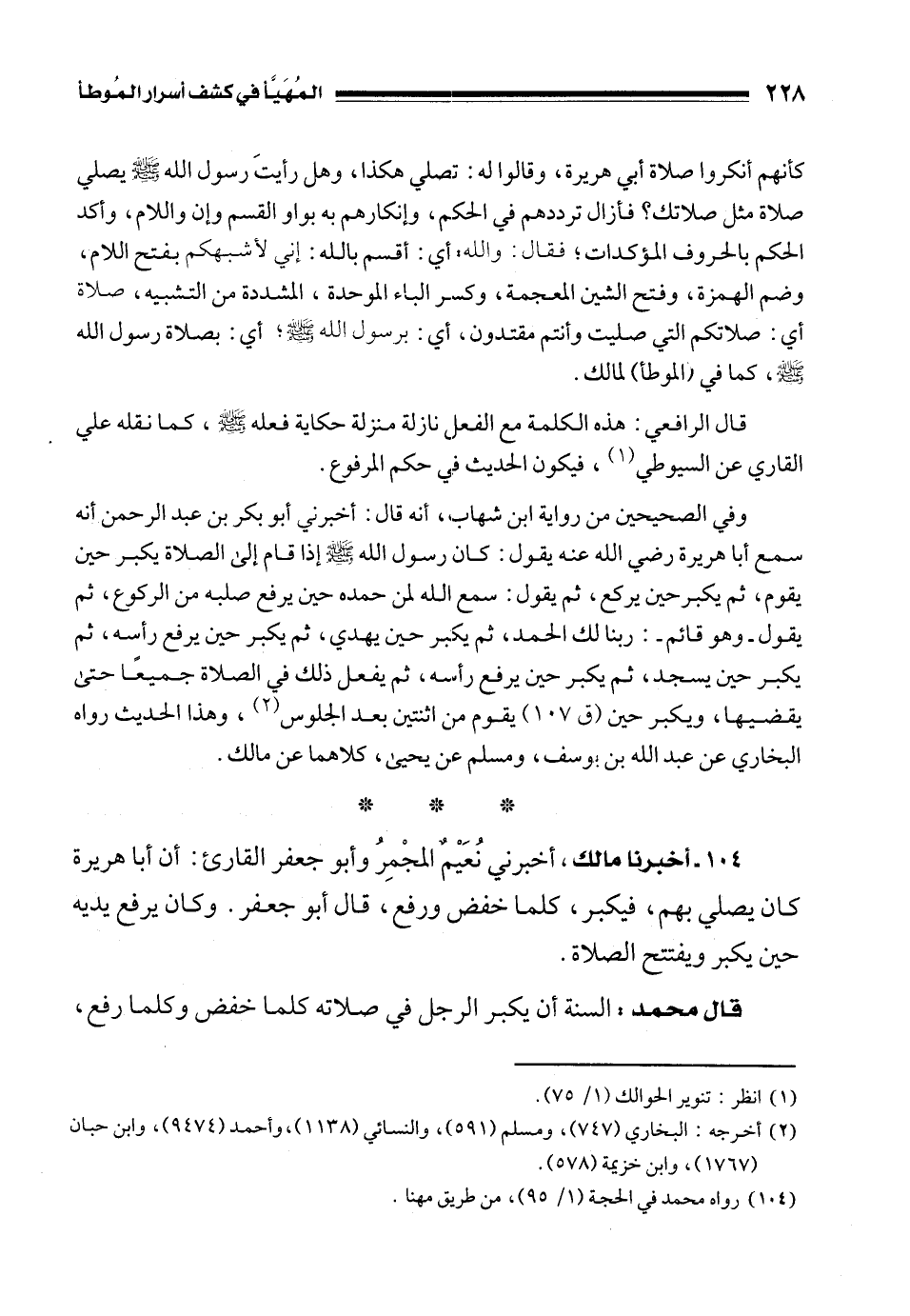 104 - أخبرنا مالك، أخبرني نُعَيْمٌ المجْمِرُ وأبو جعفر القارئ: أن أبا هريرة كان يصلي بهم، فيكبر، كلما خفض ورفع، قال أبو جعفر. وكان يرفع يديه حين يكبر ويفتتح الصلاة.
