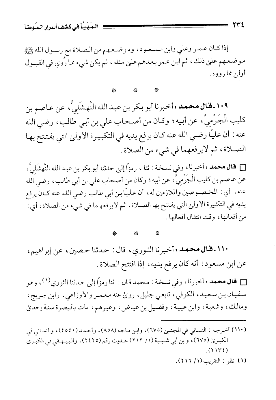 110 - قال محمد: أخبرنا الثوري، قال: حدثنا حصين، عن إبراهيم، عن ابن مسعود: أنه كان يرفع يديه، إذا افتتح الصلاة.