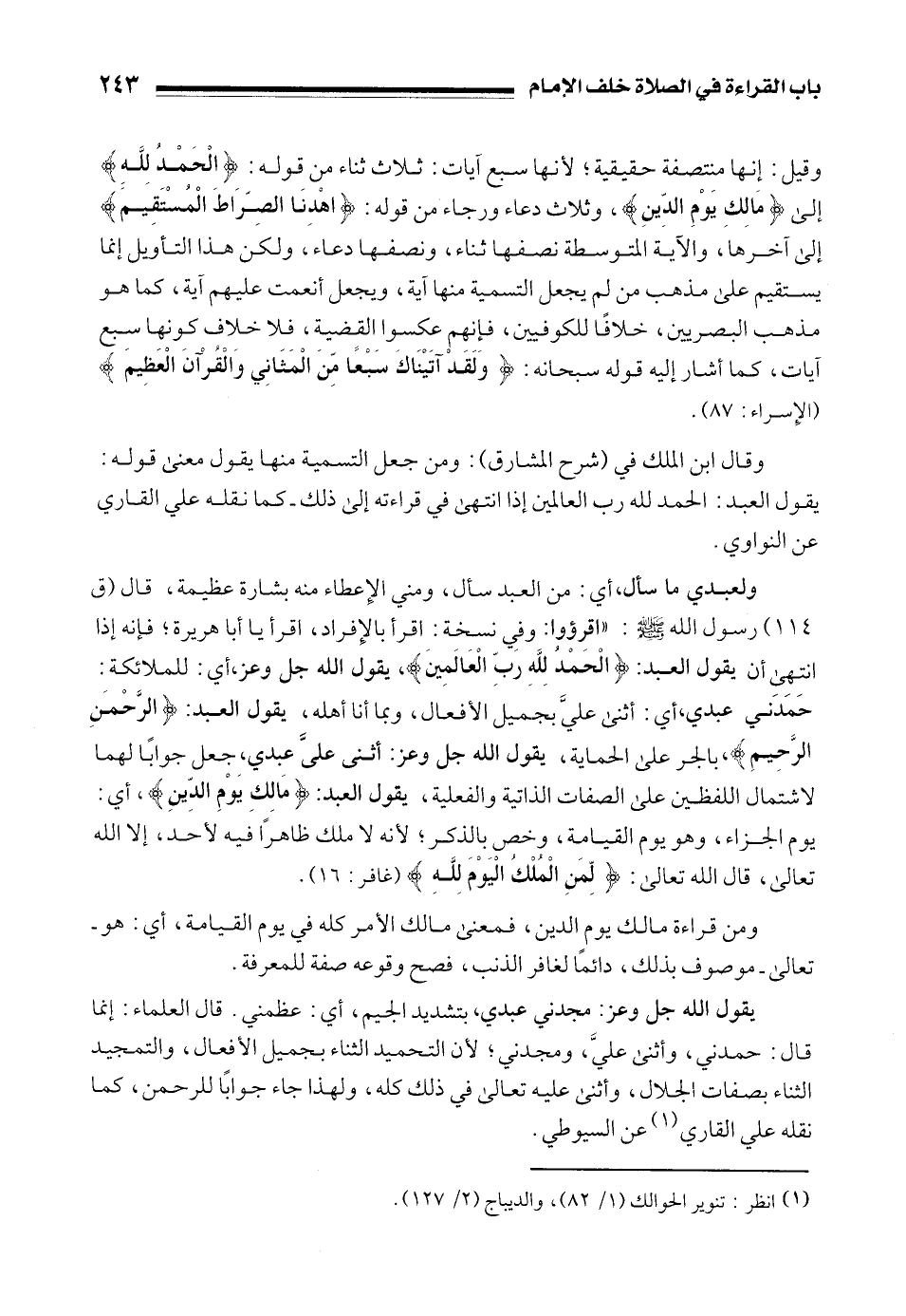 وقال ابن الملك في (شرح المشارق): ومن جعل التسمية منها يقول معنى قوله: يقول العبد: الحمد لله رب العالمين إذا انتهى في قراءته إلى ذلك - كما نقله علي القاري عن النواوي.