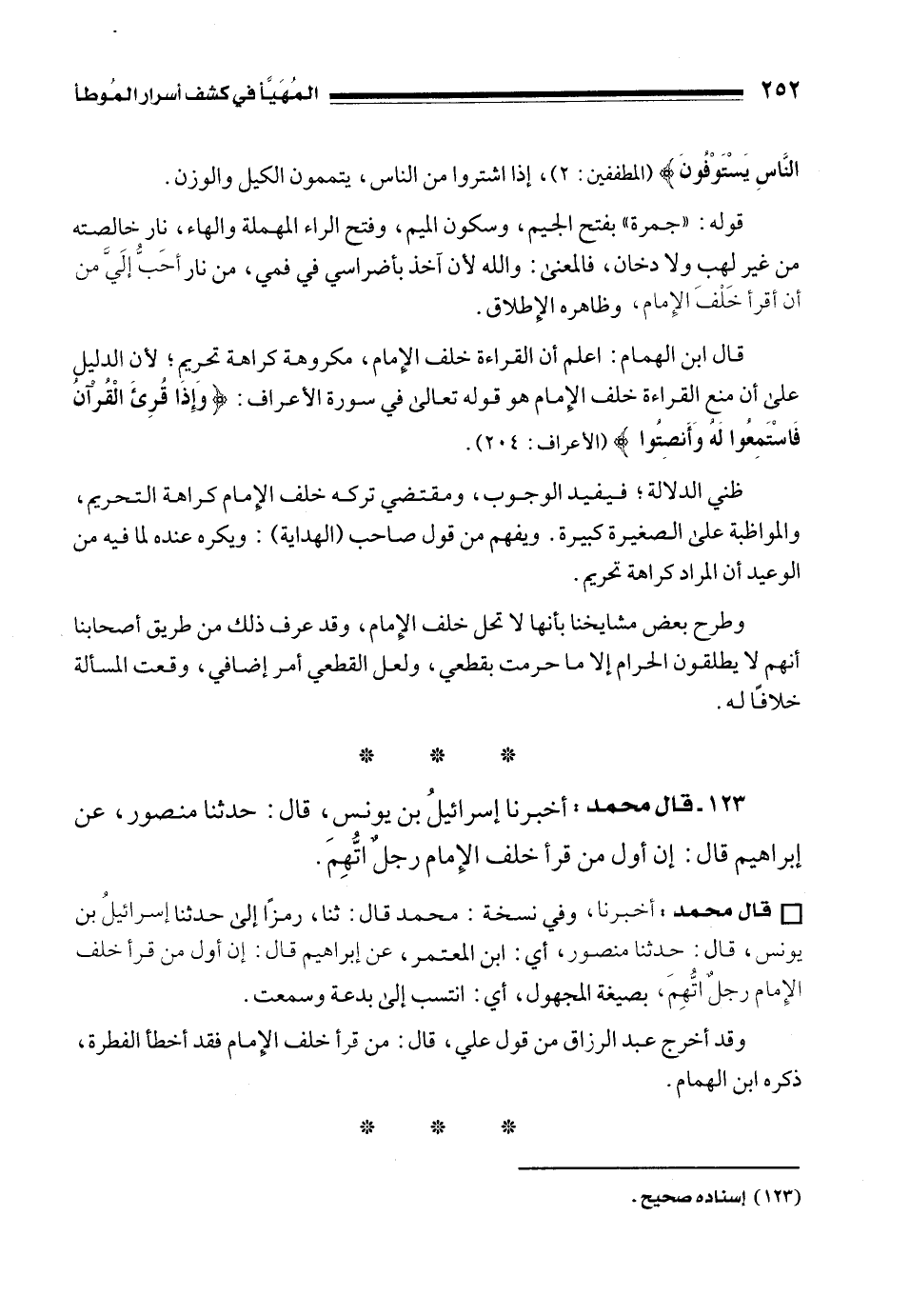 123 - قال محمد: أخبرنا إسرائيلُ بن يونس، قال: حدثنا منصور، عن إبراهيم قال: إن أول من قرأ خلف الإِمام رجلٌ اتُّهِمَ.