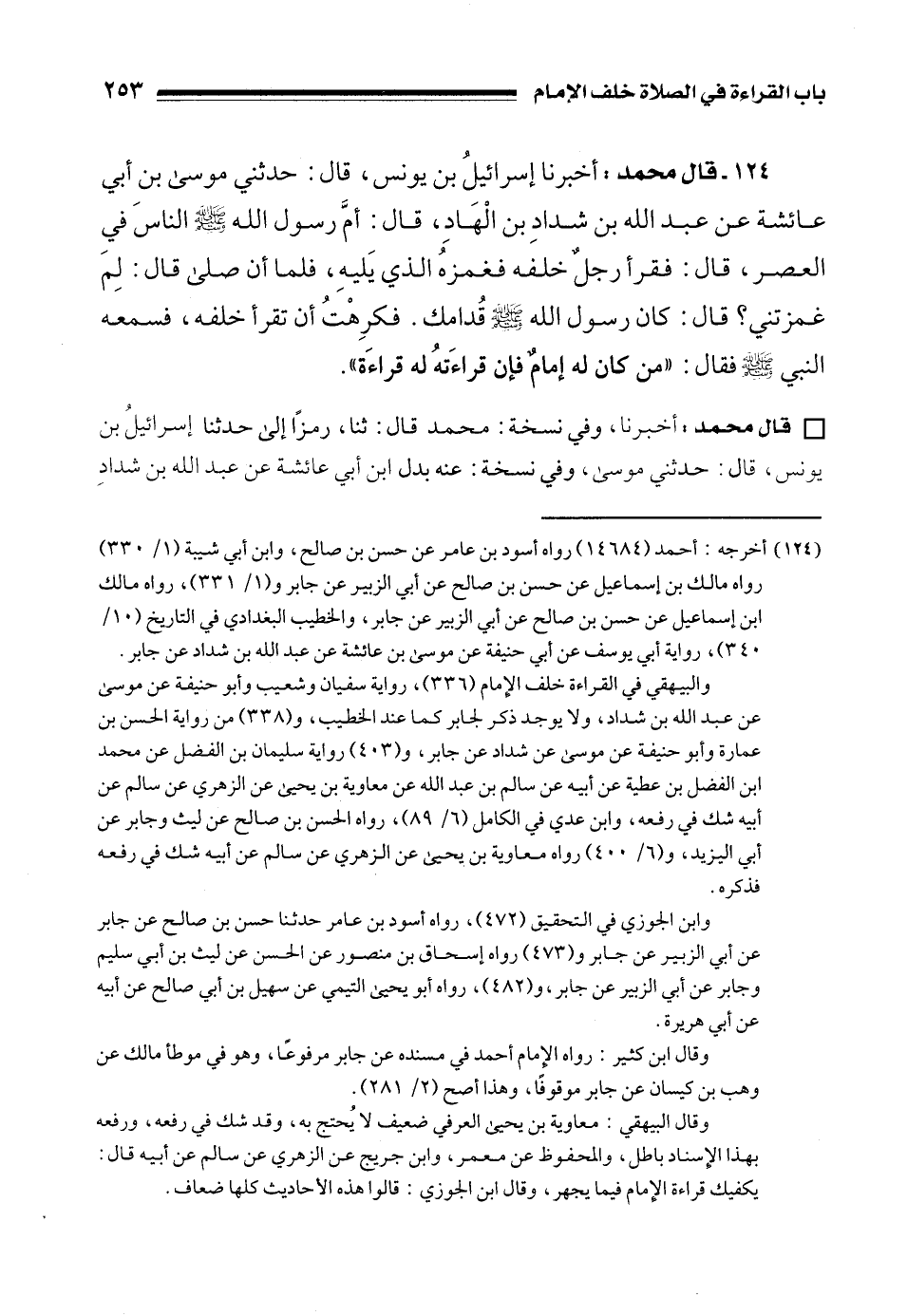 124 - قال محمد: أخبرنا إسرائيلُ بن يونس، قال: حدثني موسى بن أبي عائشة عن عبد الله بن شدادِ بن الْهَادِ، قال: أمَّ رسول الله - صلى الله عليه وسلم - الناسَ في العصر، قال: فقرأ رجلٌ خلفه فغمزهُ الذي يَليهِ، فلما أن صلى قال: لِمَ غمزتني؟ قال: كان رسول الله - صلى الله عليه وسلم - قُدامك. فكرِهْتُ أن تقرأ خلفه، فسمعه النبي - صلى الله عليه وسلم - فقال: "من كان له إمامٌ فإن قراءَتهُ له قراءَة".