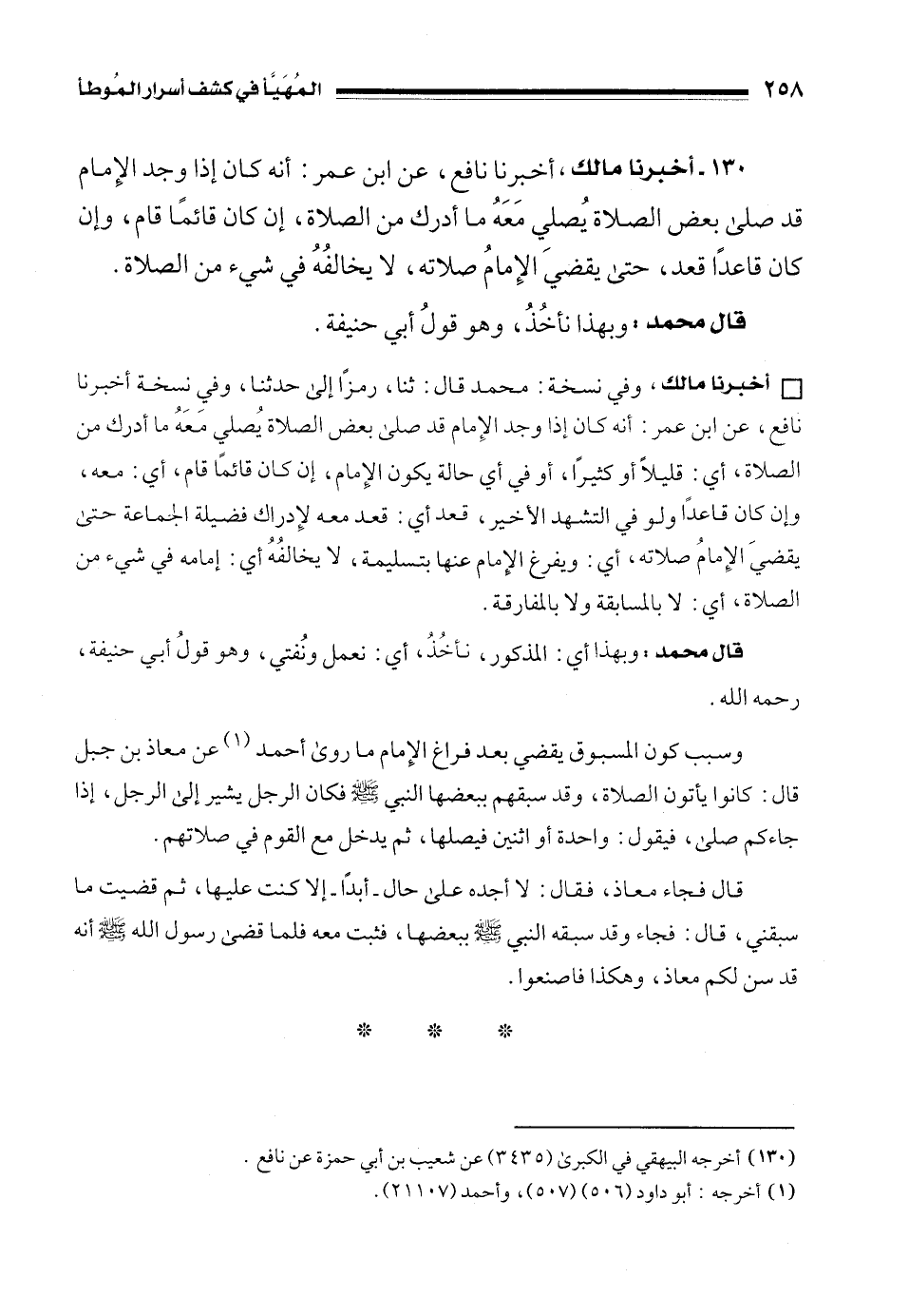 130 - أخبرنا مالك، أخبرنا نافع، عن ابن عمر: أنه كان إذا وجد الإِمام قد صلى بعض الصلاة يُصلي مَعَهُ ما أدرك من الصلاة، إن كان قائمًا قام، وإن كان قاعدًا قعد، حتى يقضيَ الإِمامُ صلاته، لا يخالفُهُ في شيء من الصلاة.