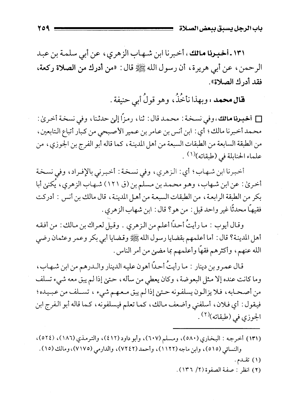 131 - أخبرنا مالك، أخبرنا ابن شهاب الزهري، عن أبي سلمة بن عبد الرحمن، عن أبي هريرة، أن رسول الله - صلى الله عليه وسلم - قال: "من أدرك من الصلاة ركعة، فقد أدرك الصلاة".