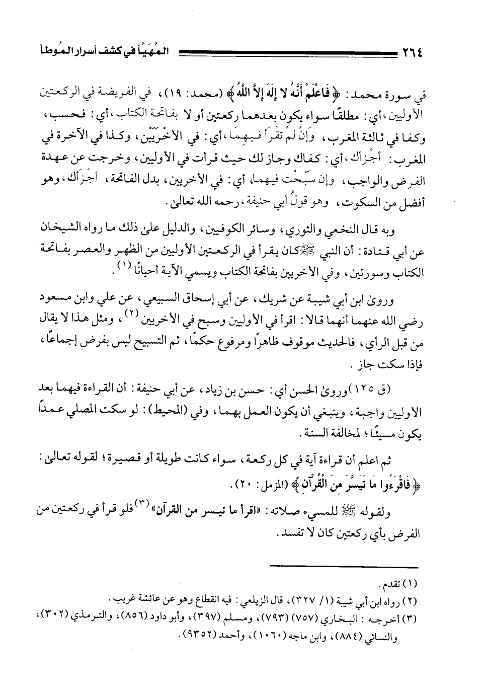 في سورة محمد: {فَاعْلَمْ أَنَّهُ لَا إِلَهَ إِلَّا اللَّهُ} [محمد: 19]، في الفريضة في الركعتين الأوليين، أي: مطلقًا سواء يكون بعدهما ركعتين أو لا بفاتحة الكتاب، أي: فحسب، وكفا في ثالثة المغرب، وَإنْ لمْ تقْرَأ فيهِمَا، أي: في الأخْرَيَيْن، وكذا في الآخرة في المغرب: أجْزأك، أي: كفاك وجاز لك حيث قرأت في الأوليين، وخرجت عن عهدة الفرض والواجب، وإن سَبّحْت فيهما، أي: في الأخريين، بدل الفاتحة، أجْزَأك، وهو أفضل من السكوت، وهو قولُ أبي حنيفة، رحمه الله تعالى.
