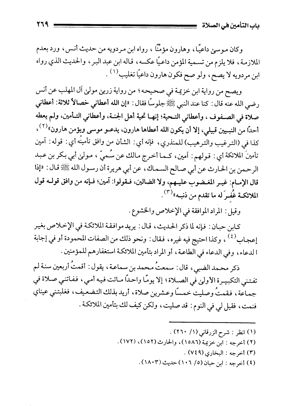 ويصح من رواية ابن خزيمة في صحيحه؛ من رواية زربى مولى آل المهلب عن أنس رضي الله عنه قال: كنا عند النبي - صلى الله عليه وسلم - جلوسًا فقال: "إن الله أعطاني خصالًا ثلاثة: أعطاني صلاة في الصفوف، وأعطاني التحية؛ إنها تحية أهل الجنة، وأعطاني التأمين، ولم يعطه أحدًا من النبيين قبيلي، إلا أن يكون الله أعطاها هارون، يدعو موسى ويؤمن هارون" (¬2)، كذا في (الترغيب والترهيب) للمنذري، فإنه أي: الشأن من وافق تأمينُه أي: قوله: آمين تأمينَ الملائكة أي: قولهم: آمين، كما أخرج مالك عن سُميّ، مولى أبي بكر بن عبد الرحمن بن الحارث عن أبي صالح السماك، عن أبي هريرة أن رسول الله - صلى الله عليه وسلم - قال: "إذا قال الإمام: غير المغضوب عليهم، ولا الضالين، فقولوا: آمين؛ فإنه من وافق قوله قول الملائكة غُفِرَ له ما تقدم من ذنبه" (¬3).