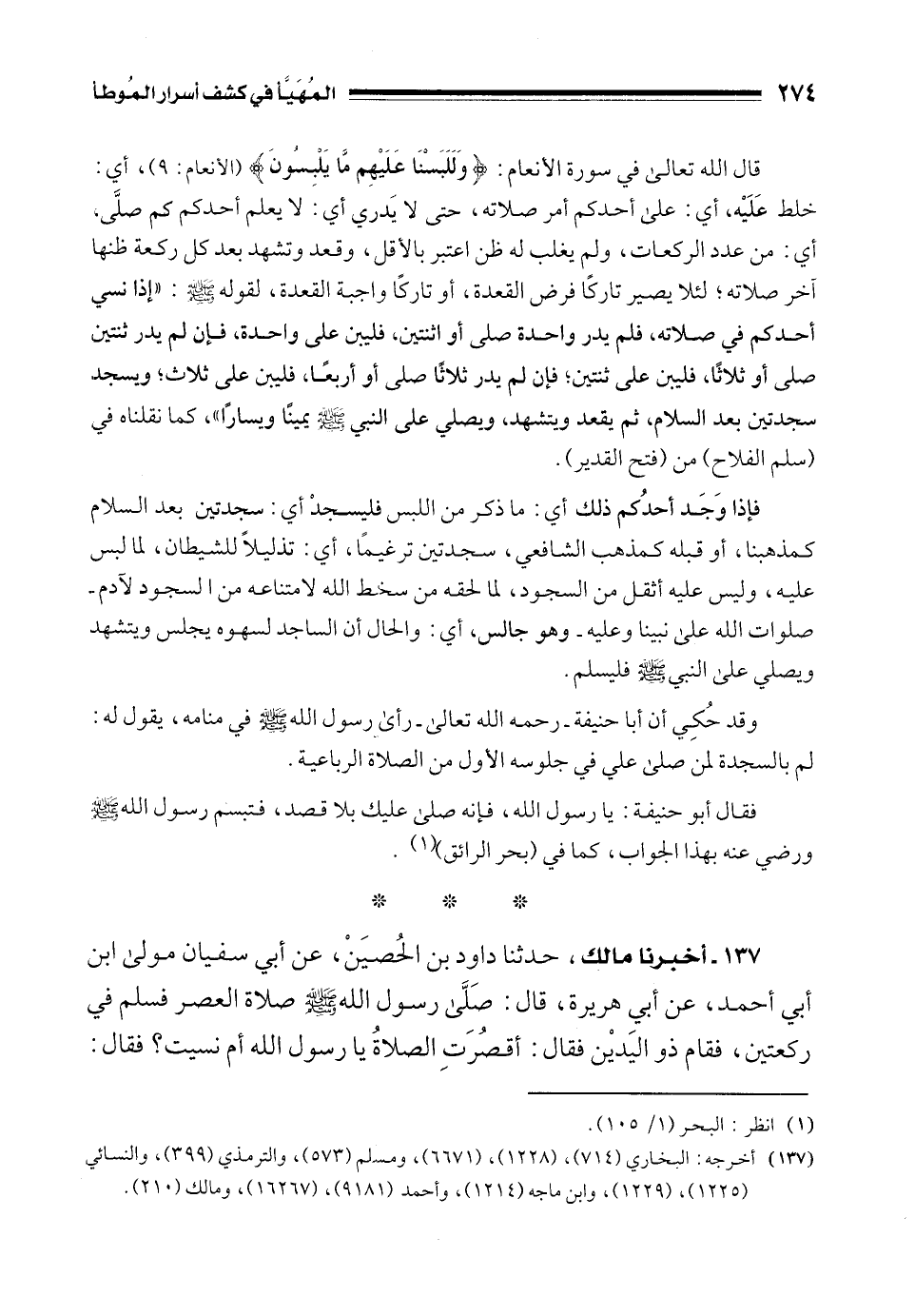 137 - أخبرنا مالك، حدثنا داود بن الحُصَيْن، عن أبي سفيان مولى ابن أبي أحمد، عن أبي هريرة، قال: صَلَّى رسول الله - صلى الله عليه وسلم - صلاة العصر فسلم في ركعتين، فقام ذو اليَديْن فقال: أقصُرَتِ الصلاةُ يا رسول الله أم نسيت؟ فقال: