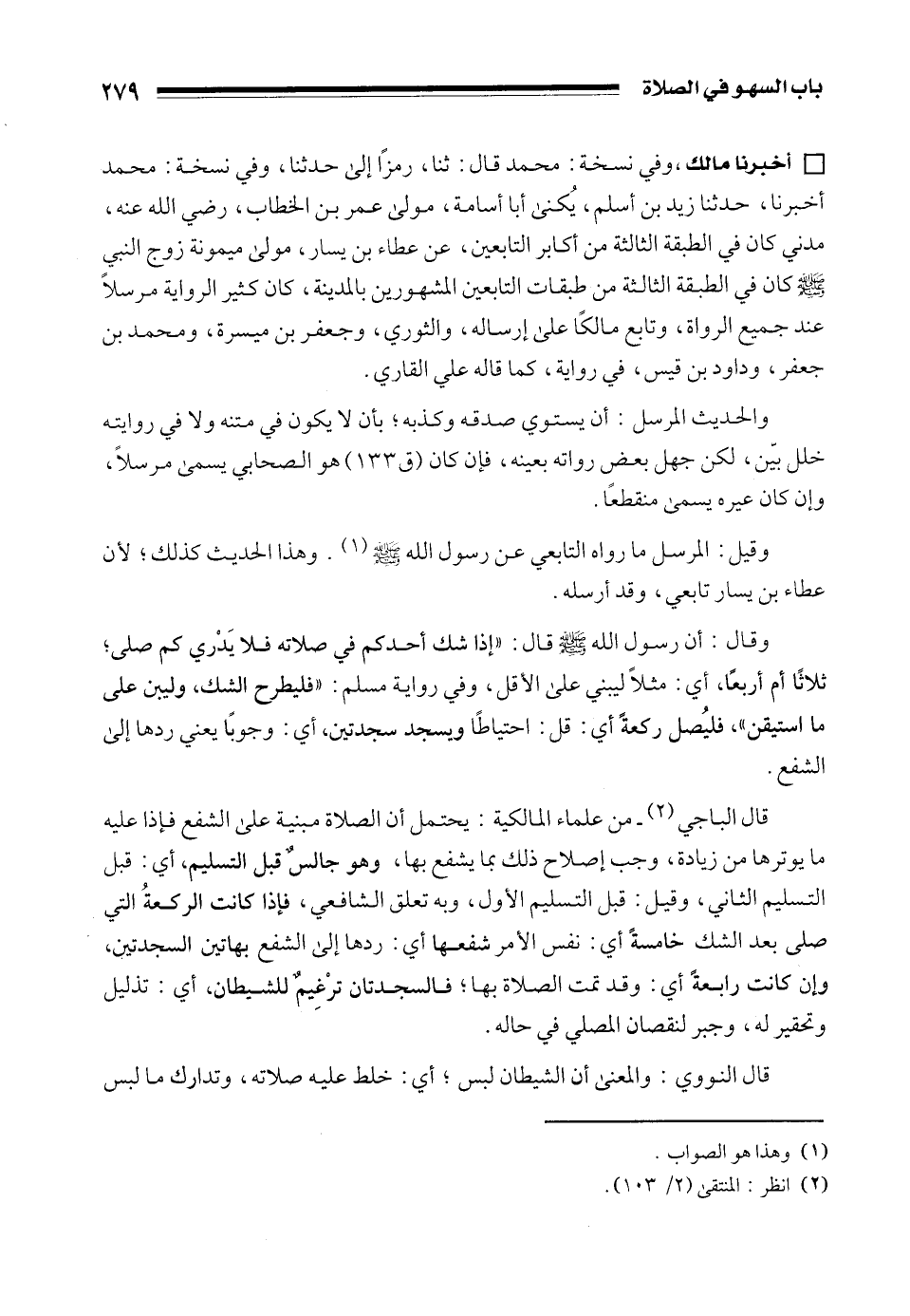 • أخبرنا مالك، وفي نسخة: محمد قال: ثنا، رمزًا إلى حدثنا، وفي نسخة: محمد أخبرنا، حدثنا زيد بن أسلم، يُكنى أبا أسامة، مولى عمر بن الخطاب، رضي الله عنه، مدني كان في الطبقة الثالثة من أكابر التابعين، عن عطاء بن يسار، مولى ميمونة زوج النبي - صلى الله عليه وسلم - كان في الطبقة الثالثة من طبقات التابعين المشهورين بالمدينة، كان كثير الرواية مرسلًا عند جميع الرواة، وتابع مالكًا على إرساله، والثوري، وجعفر بن ميسرة، ومحمد بن جعفر، وداود بن قيس، في رواية، كما قاله علي القاري.