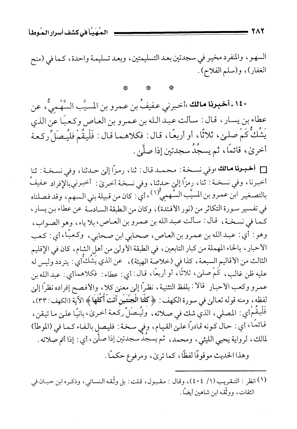 • أخبرنا مالك، وفي نسخة: محمد قال: ثنا، رمزًا إلى حدثنا، وفي نسخة: ثنا أخبرنا، وفي نسخة: ثنا، رمزًا إلى حدثنا، وفي نسخة أخرى: أخبرني بالإِفراد عفيفُ بالتصغير ابن عمرو بن المسيَّب السَّهمِيُّ (¬1)، أي: كان من قبيلة بني السهم، وقد فصلناه في تفسير سورة التكاثر من (نور الأفئدة)، وكان من الطبقة السادسة عن عطاء بن يسار، كما في نسخة، قال: سألت عبد الله بن عمرو بن العاص، بلا ياء، وهو الصواب، وهو: أي: عبد الله بن عمرو بن العاص، صحابي ابن صحابي، وكعبًا، أي: كعب الأحبار، بالحاء المهملة من كبار التابعين، في الطبقة الأولى من أهل الشام، كان في الإِقليم الثالث من الأقاليم السبعة، كذا في (خلاصة الهيئة)، عن الذي يَشُكُّ أي: يتردد وليس له عليه ظن غالب، كَمْ صلى، ثلاثًا، أو أربعًا، قال: أي: عطاء: فكلاهما أي: عبد الله بن عمرو وكعب الأحبار قالا: بلفظ التثنية، نظرًا إلى معنى كلا، والأفصح إفراده نظرًا إلى لفظه، ومنه قوله تعالى في سورة الكهف: {كِلْتَا الْجَنَّتَيْنِ آتَتْ أُكُلَهَا} الآية [الكهف: 33]، فَلْيقُمْ أي: المصلي، الذي شك في صلاته، وَليُصَلِّ ركعة أخرى، بانيًا على ما تيقن، قائمًا، أي: حال كونه قادرًا على القيام، وفي نسخة: فليصل بالفاء كما في (الموطأ) لمالك، لرواية يحيى الليثي، ومحمد، ثم يسجُدُ سجدتين إذا صلَّى، أي: إذا أتم صلاته.