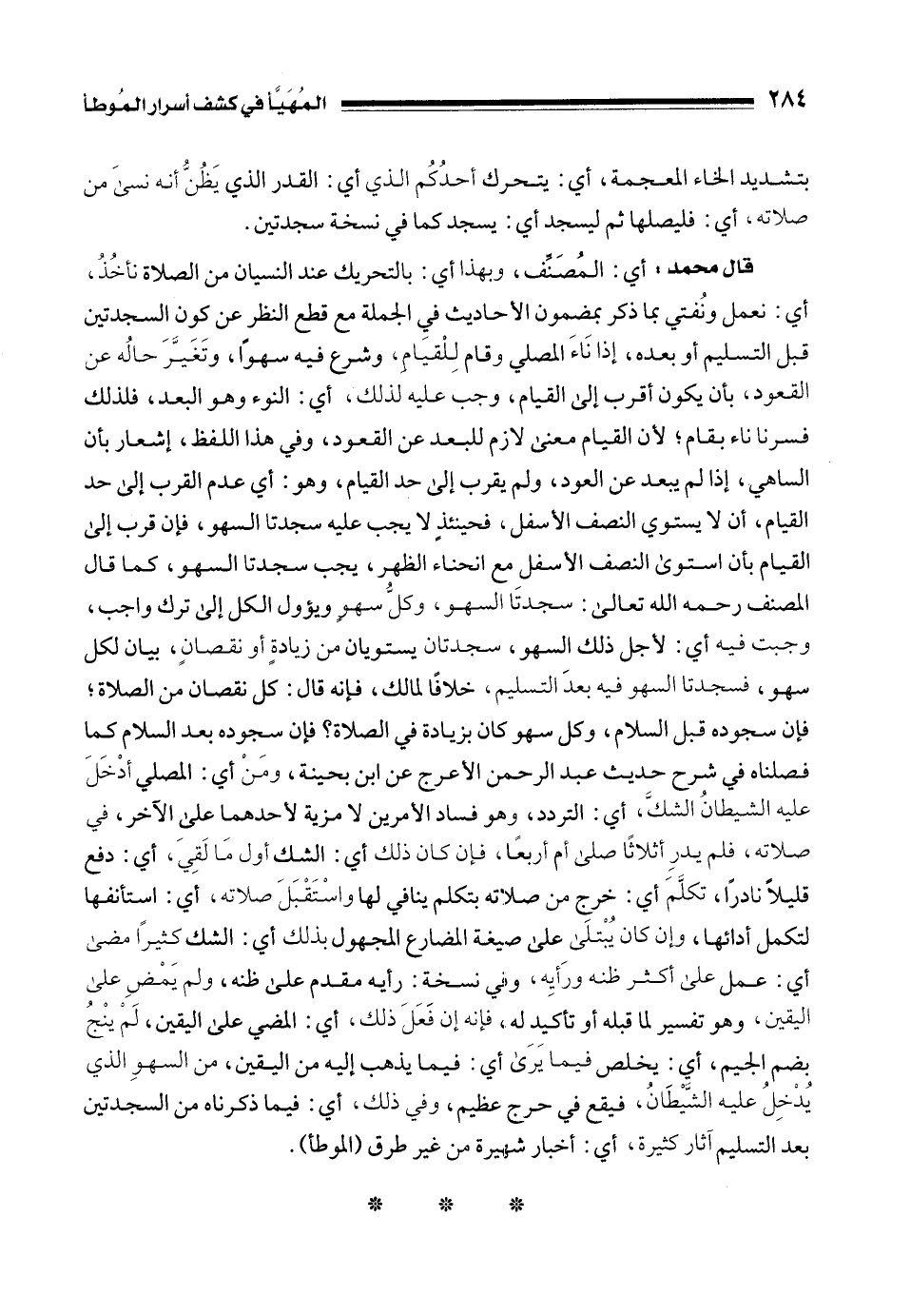 قال محمد: أي: المُصَنِّف، وبهذا أي: بالتحريك عند النسيان من الصلاة نأخُذُ، أي: نعمل ونُفتي بما ذكر بمضمون الأحاديث في الجملة مع قطع النظر عن كون السجدتين قبل التسليم أو بعده، إذا نَاءَ المصلي وقام لِلْقيَامِ، وشرع فيه سهوًا، وتَغَيَّرَ حالُه عن القعود، بأن يكون أقرب إلى القيام، وجب عليه لذلك، أي: النوء وهو البعد، فلذلك فسرنا ناء بقام؛ لأن القيام معنى لازم للبعد عن القعود، وفي هذا اللفظ، إشعار بأن الساهي، إذا لم يبعد عن العود، ولم يقرب إلى حد القيام، وهو: أي عدم القرب إلى حد القيام، أن لا يستوي النصف الأسفل، فحينئذٍ لا يجب عليه سجدتا السهو، فإن قرب إلى القيام بأن استوى النصف الأسفل مع انحناء الظهر، يجب سجدتا السهو، كما قال المصنف رحمه الله تعالى: سجدتَا السهو، وكلُّ سهوٍ ويؤول الكل إلى ترك واجب، وجبت فيه أي: لأجل ذلك السهو، سجدتان يستويان من زيادةٍ أو نقصانٍ، بيان لكل سهو، فسجدتا السهو فيه بعدَ التسليم، خلافًا لمالك، فإنه قال: كل نقصان من الصلاة؛ فإن سجوده قبل السلام، وكل سهو كان بزيادة في الصلاة؟ فإن سجوده بعد السلام كما فصلناه في شرح حديث عبد الرحمن الأعرج عن ابن بحينة، ومَنْ أي: المصلي أدْخَلَ عليه الشيطانُ الشكَّ، أي: التردد، وهو فساد الأمرين لا مزية لأحدهما على الآخر، في صلاته، فلم يدرِ أثلاثًا صلى أم أربعًا، فإن كان ذلك أي: الشك أول مَا لَقِيَ، أي: دفع قليلًا نادرًا، تكلَّمَ أي: خرج من صلاته بتكلم ينافي لها واسْتَقْبَلَ صلاته، أي: استأنفها لتكمل أدائها، وإن كان يُبتلَى على صيغة المضارع المجهول بذلك أي: الشك كثيرًا مضى أي: عمل على أكثر ظنه ورَأيِه، وفي نسخة: رأيه مقدم على ظنه، ولم يَمْضِ على اليقين، وهو تفسير لما قبله أو تأكيد له، فإنه إن فَعَلَ ذلك، أي: المضي على اليقين، لَمْ ينْجُ بضم الجيم، أي: يخلص فيما يَرَى أي: فيما يذهب إليه من اليقين، من السهوِ الذي يُدْخِلُ عليه الشَّيْطَانُ، فيقع في حرج عظيم، وفي ذلك، أي: فيما ذكرناه من السجدتين بعد التسليم آثار كثيرة، أي: أخبار شهيرة من غير طرق (الموطأ).