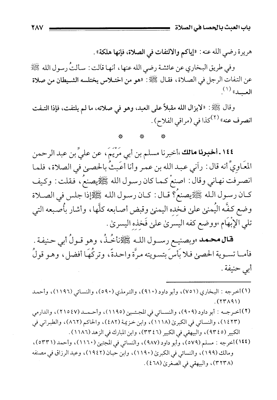 144 - أخبرنا مالك، أخبرنا مسلم بن أبي مَرْيَمَ، عن عليِّ بن عبد الرحمن المعَاوِيِّ أنه قال: رآني عبد الله بن عمر وأنا أعبَثُ بالحصى في الصلاة، فلما انصرفت نهاني وقال: اصنعْ كما كان رسول الله - صلى الله عليه وسلم - يصنعُ، فقلت: وكيف كان رسول الله - صلى الله عليه وسلم - يصنعُ؟ قال: كان رسول الله - صلى الله عليه وسلم - إذا جلس في الصلاة وضع كفَّه اليُمنى على فخِذِه اليمنى وقبض أصابعه كلَّها، وأشار بأُصبعه التي تلي الإِبْهَام، ووضع كفه اليسرى على فَخِذِهِ اليسرى.