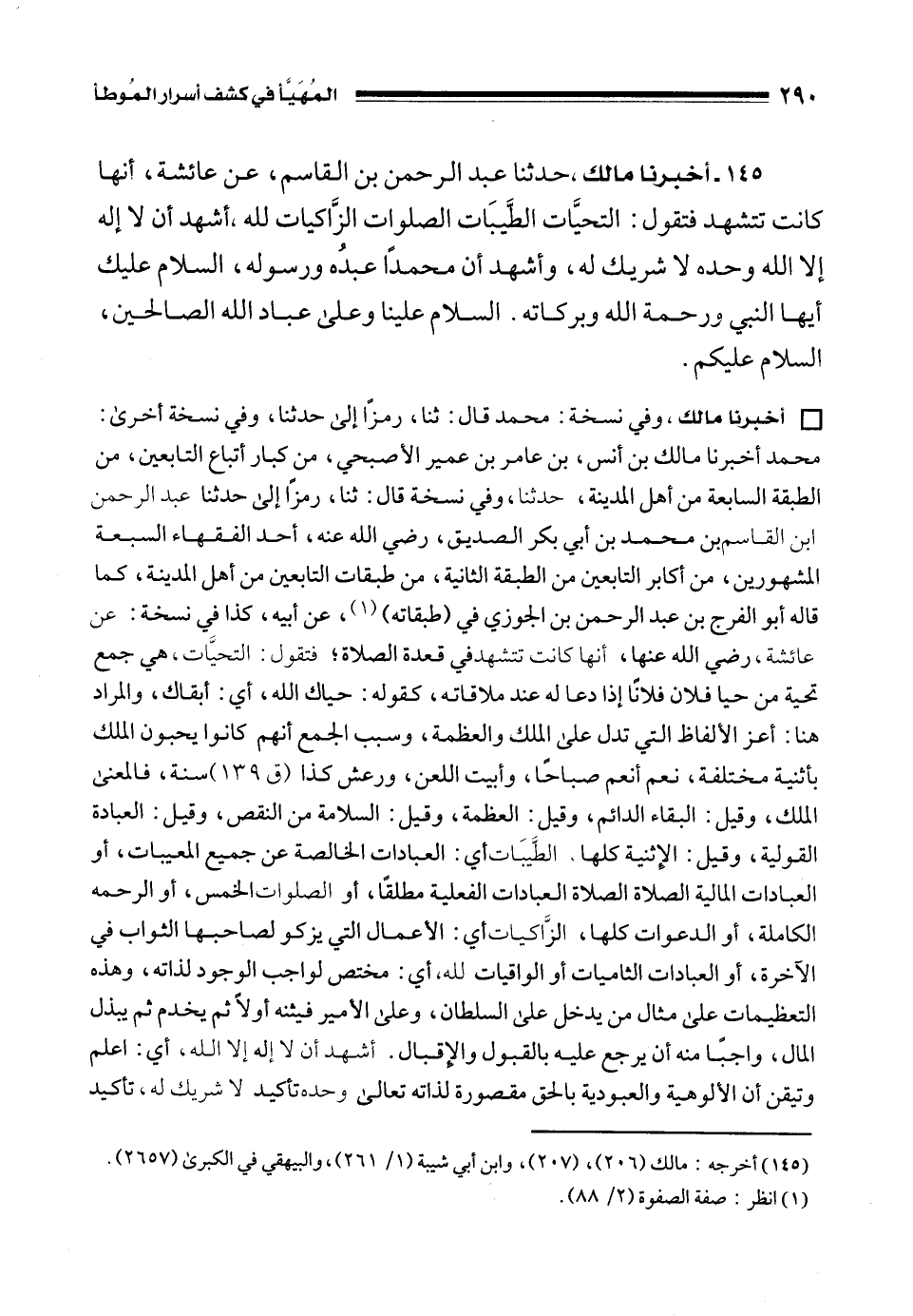 • أخبرنا مالك، وفي نسخة: محمد قال: ثنا، رمزًا إلى حدثنا، وفي نسخة أخرى: محمد أخبرنا مالك بن أنس، بن عامر بن عمير الأصبحي، من كبار أتباع التابعين، من الطبقة السابعة من أهل المدينة، حدثنا، وفي نسخة قال: ثنا، رمزًا إلى حدثنا عبد الرحمن بن القاسم بن محمد بن أبي بكر الصديق، رضي الله عنه، أحد الفقهاء السبعة المشهورين، من أكابر التابعين من الطبقة الثانية، من طبقات التابعين من أهل المدينة، كما قال أبو الفرج بن عبد الرحمن بن الجوزي في (طبقاته) (¬1)، عن أبيه، كذا في نسخة: عن عائشة، رضي الله عنها، أنها كانت تتشهد في قعدة الصلاة؛ فتقول: التحيَّات، هي جمع تحية من حيا فلان فلانا إذا دعا لى عند ملاقاته، كقوله: حياك الله، أي: أبقاك، والمراد هنا: أعز الألفاظ التي تدل على الملك والعظمة، وسبب الجمع أنهم كانوا يحبون الملك بأثنية مختلفة، نعم أنعم صباحًا، وأبيت اللعن، ورعش كذا (ق 139) سنة، فالمعنى الملك، وقيل: البقاء الدائم، وقيل: العظمة، وقيل: السلامة من النقص، وقيل: العبادة القولية، وقيل: الإِثنية كلها، الطَّيبَات أي: العبادات الخالصة عن جميع المعيبات، أو العبادات المالية الصلاة الصلاة العبادات الفعلية مطلقًا، أو الصلوات الخمس، أو الرحمة الكاملة، أو الدعوات كلها، الزَّاكيات أي: الأعمال التي يزكو لصاحبها الثواب في الآخرة، أو العبادات الثاميات أو الواقيات لله، أي: مختص لواجب الوجود لذاته، وهذه التعظيمات على مثال من يدخل على السلطان، وعلى الأمير فيثنه أولًا ثم يخدم ثم يبذل المال، واجبًا منه أن يرجع عليه بالقبول والإِقبال. أشهد أن لا إله إلا الله، أي: اعلم وتيقن أن الألوهية والعبودية بالحق مقصورة لذاته تعالى وحده تأكيد لا شريك له، تأكيد
