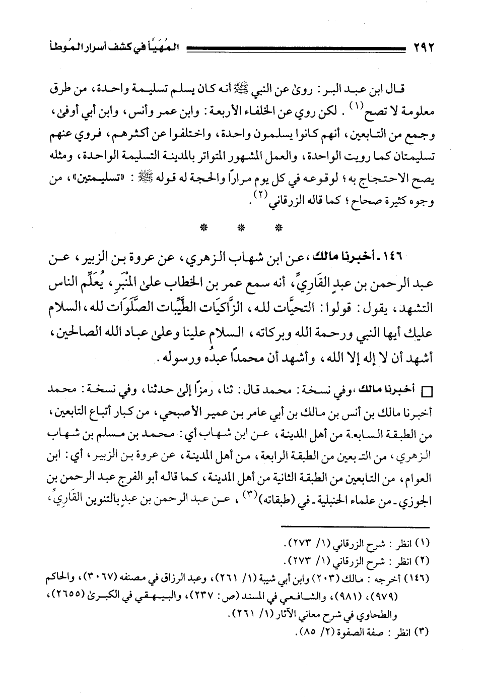 146 - أخبرنا مالك، عن ابن شهاب الزهري، عن عروة بن الزبير، عن عبد الرحمن بن عبدٍ القَارِيِّ، أنه سمع عمر بن الخطاب على المنْبَرِ، يُعَلِّم الناس التشهد، يقول: قولوا: التحيَّات لله، الزَّاكيَات الطَّيِّبات الصَّلَوَات لله، السلام عليك أيها النبي ورحمة الله وبركاته، السلام علينا وعلى عباد الله الصالحين، أشهد أن لا إله إلا الله، وأشهد أن محمدًا عبدُه ورسوله.