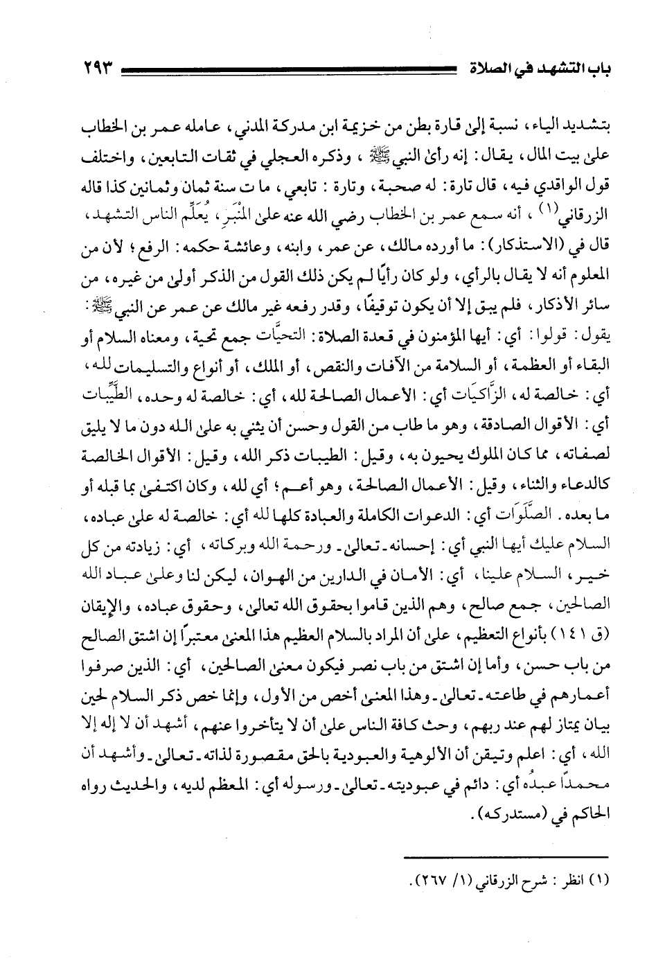 بتشديد الياء، نسبة إلى قارة بطن من خزيمة ابن مدركة المدني، عامله عمر بن الخطاب على بيت المال، يقال: إنه رأى النبي - صلى الله عليه وسلم -، وذكره العجلي في ثقات التابعين، واختلف قول الواقدي فيه، قال تارة: له صحبة، وتارة: تابعي، مات سنة ثمان وثمانين كذا قاله الزرقاني (¬1)، أنه سمع عمر بن الخطاب رضي الله عنه على المنْبَرِ، يُعَلِّم الناس التشهد، قال في (الاستذكار): ما أورده مالك، عن عمر، وابنه، وعائشة حكمه: الرفع؛ لأن من المعلوم أنه لا يقال بالرأي، ولو كان رأيًا لم يكن ذلك القول من الذكر أولى من غيره، من سائر الأذكار، فلم يبق إلا أن يكون توقيفًا، وقدر رفعه غير مالك عن عمر عن النبي - صلى الله عليه وسلم -: يقول: قولوا: أي: أيها المؤمنون في قعدة الصلاة: التحيَّات جمع تحية، ومعناه السلام أو البقاء أو العظمة، أو السلامة من الآفات والنقص، أو الملك، أو أنواع والتسليمات لله، أي: خالصة له، الزَّاكيَات أي: الأعمال الصالحة لله، أي: خالصة له وحده، الطَّيِّبات أي: الأقوال الصادقة، وهو ما طاب من القول وحسن أن يثني به على الله دون ما لا يليق لصفاته، مما كان الملوك يحيون به، وقيل: الطيبات ذكر الله، وقيل: الأقوال الخالصة كالدعاء والثناء، وقيل: الأعمال الصالحة، وهو أعم؛ أي لله، وكان اكتفى بما قبله أو ما بعده. الصَّلَوَات أي: الدعوات الكاملة والعبادة كلها لله أي: خالصة له على عباده، السلام عليك أيها النبي أي: إحسانه - تعالى - ورحمة الله وبركاته، أي: زيادته من كل خير، السلام علينا، أي: الأمان في الدارين من الهوان، ليكن لنا وعلى عباد الله الصالحين، جمع صالح، وهم الذين قاموا بحقوق الله تعالى، وحقوق عباده، والإِيقان (ق 141) بأنواع التعظيم، على أن المراد بالسلام العظيم هذا المعنى معتبرًا إن اشتق الصالح من باب حسن، وأما إن اشتق من باب نصر فيكون معنى الصالحين، أي: الذين صرفوا أعمارهم في طاعته - تعالى - وهذا المعنى أخص من الأول، وإنما خص ذكر السلام لحين بيان يمتاز لهم عند ربهم، وحث كافة الناس على أن لا يتأخروا عنهم، أشهد أن لا إله إلا الله، أي: اعلم وتيقن أن الألوهية والعبودية بالحق مقصورة لذاته - تعالى - وأشهد أن محمدًا عبدُه أي: دائم في عبوديته - تعالى - ورسوله أي: المعظم لديه، والحديث رواه الحاكم في (مستدركه).