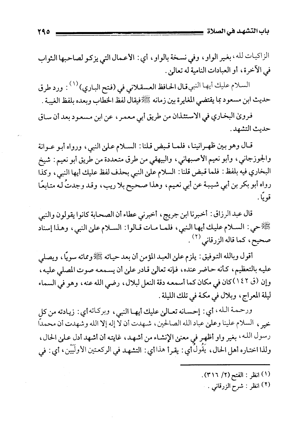 قال عبد الرزاق: أخبرنا ابن جريج، أخبرني عطاء أن الصحابة كانوا يقولون والنبي - صلى الله عليه وسلم - حي: السلام عليك أيها النبي، فلما مات قالوا: السلام على النبي، وهذا إسناد صحيح، كما قاله الزرقاني (¬2).
