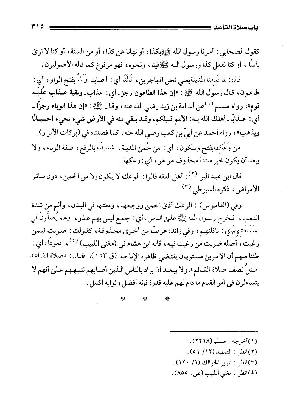 وفي (القاموس): الوعك أذى الحمى ووجعها، ومقتها في البدن، وألم من شدة التعب، فخرج رسول الله - صلى الله عليه وسلم - على الناس، أي: جمع ليس بهم عذر، وهم يُصلُّونَ في سُبْحَتِهِمْ أي: نافلتهم، وفي زائدة عرضًا من أخرى محذوفة، كقولك: ضربت فيمن رغبت، أصله ضربت من رغبت فيه، قاله ابن هشام في (مغني اللبيب) (¬4)، قعودًا، أي: ظننا منهم أن الأمرين مستويان يقتضي ظاهره الإِباحة (ق 153)، فقال: "صلاة القاعد مثلُ نصف صلاة القائم"، ولا يبعد أن يراد بالناس الذين أصابهم ننبههم على أنهم لا يتساءلون في أمر القيام ما دام لهم عليه قدرة فإنه أفضل وثوابه أكمل.