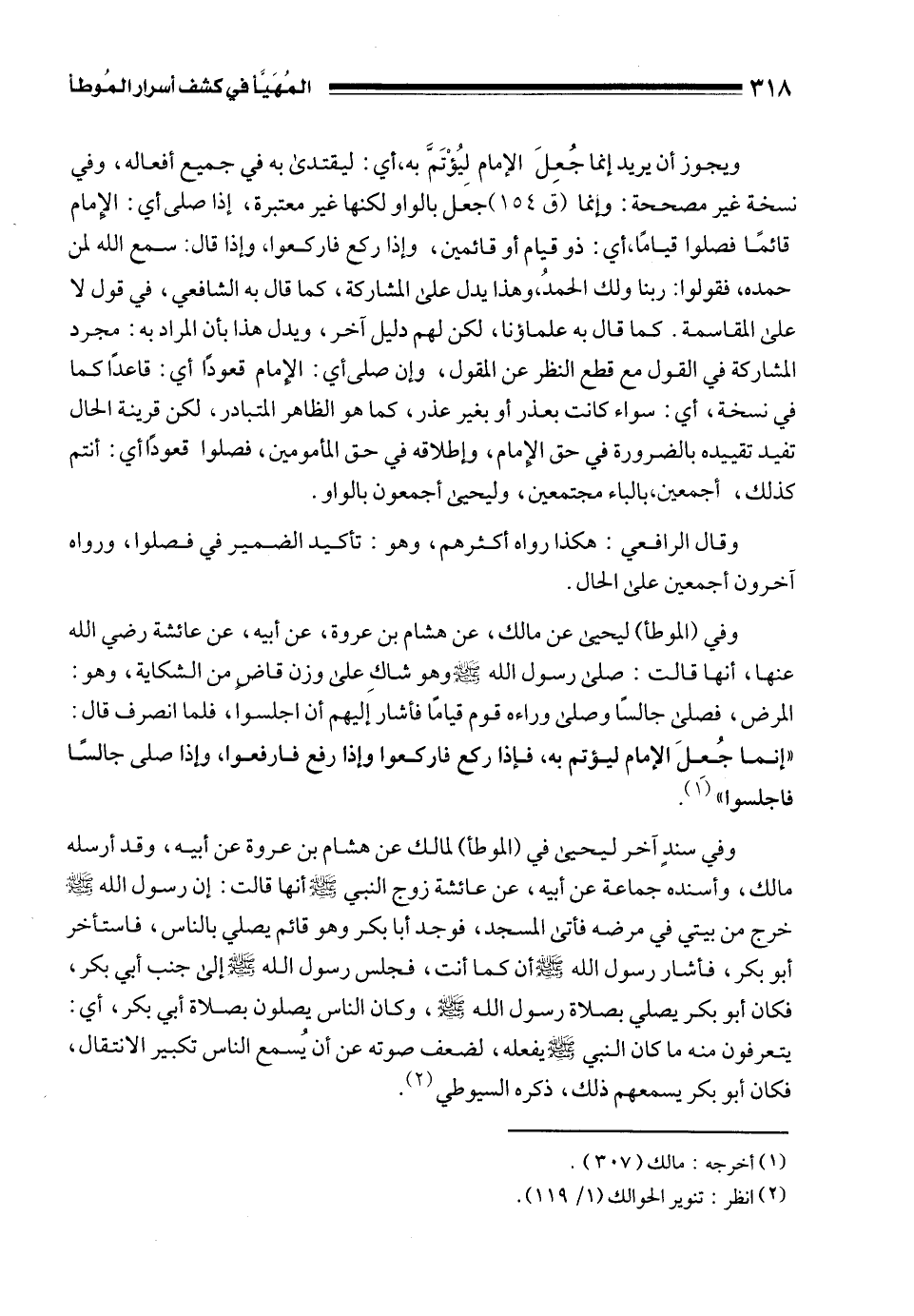 وفي سندٍ آخر ليحيى في (الموطأ) لمالك عن هشام بن عروة عن أبيه، وقد أرسله مالك، وأسنده جماعة عن أبيه، عن عائشة زوج النبي - صلى الله عليه وسلم - أنها قالت: إن رسول الله - صلى الله عليه وسلم - خرج من بيتي في مرضه فأتى المسجد، فوجد أبا بكر وهو قائم يصلي بالناس، فاستأخر أبو بكر، فأشار رسول الله - صلى الله عليه وسلم - أن كما أنت، فجلس رسول الله - صلى الله عليه وسلم - إلى جنب أبي بكر، فكان أبو بكر يصلي بصلاة رسول الله - صلى الله عليه وسلم -، وكان الناس يصلون بصلاة أبي بكر، أي: يتعرفون منه ما كان النبي - صلى الله عليه وسلم - يفعله، لضعف صوته عن أن يُسمع الناس تكبير الانتقال، فكان أبو بكر يسمعهم ذلك، ذكره السيوطي (¬2).