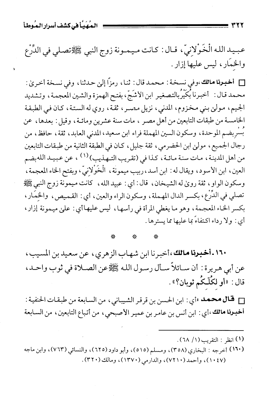 160 - أخبرنا مالك، أخبرنا ابن شهاب الزهري، عن سعيد بن المسيب، عن أبي هريرة: أن سائلًا سأل رسول الله - صلى الله عليه وسلم - عن الصلاة في ثوب واحد، قال: "أو لِكُلِّكُم ثوبان؟ ".