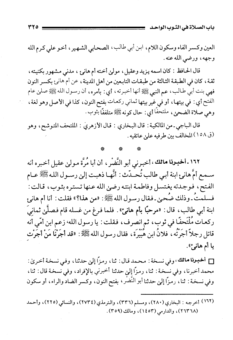 162 - أخبرنا مالك، أخبرني أبو النَّضْر، أن أبا مُرَّة مولى عقيل أخبره أنه سمع أمَّ هانئ ابنة أبي طالب تُحدّث: أنَّها ذهبت إلى رسول الله - صلى الله عليه وسلم - عام الفتح، فوجدته يغتسل وفاطمة ابنته رضي الله عنها تستره بثوب، قالت: فسلمتُ - وذلك ضُحى - فقال رسول الله - صلى الله عليه وسلم -: "من هذا؟ " فقلت: أنا أم هانئ ابنة أبي طالب، قال: "مرحبًا بأم هانئ". فلما فرغ من غسله قام فصلَّى ثمانِي ركعات مُلْتَحفًا في ثوب، ثم انصرف، فقلت: يا رسول الله، زعم ابن أمّي أنه قاتل رجلًا أجَرْتُه، فلانُ ابن هُبَيْرَة، فقال رسول الله - صلى الله عليه وسلم -: "قد أجَرْنَا مَنْ أجَرْتِ يا أم هانئ".