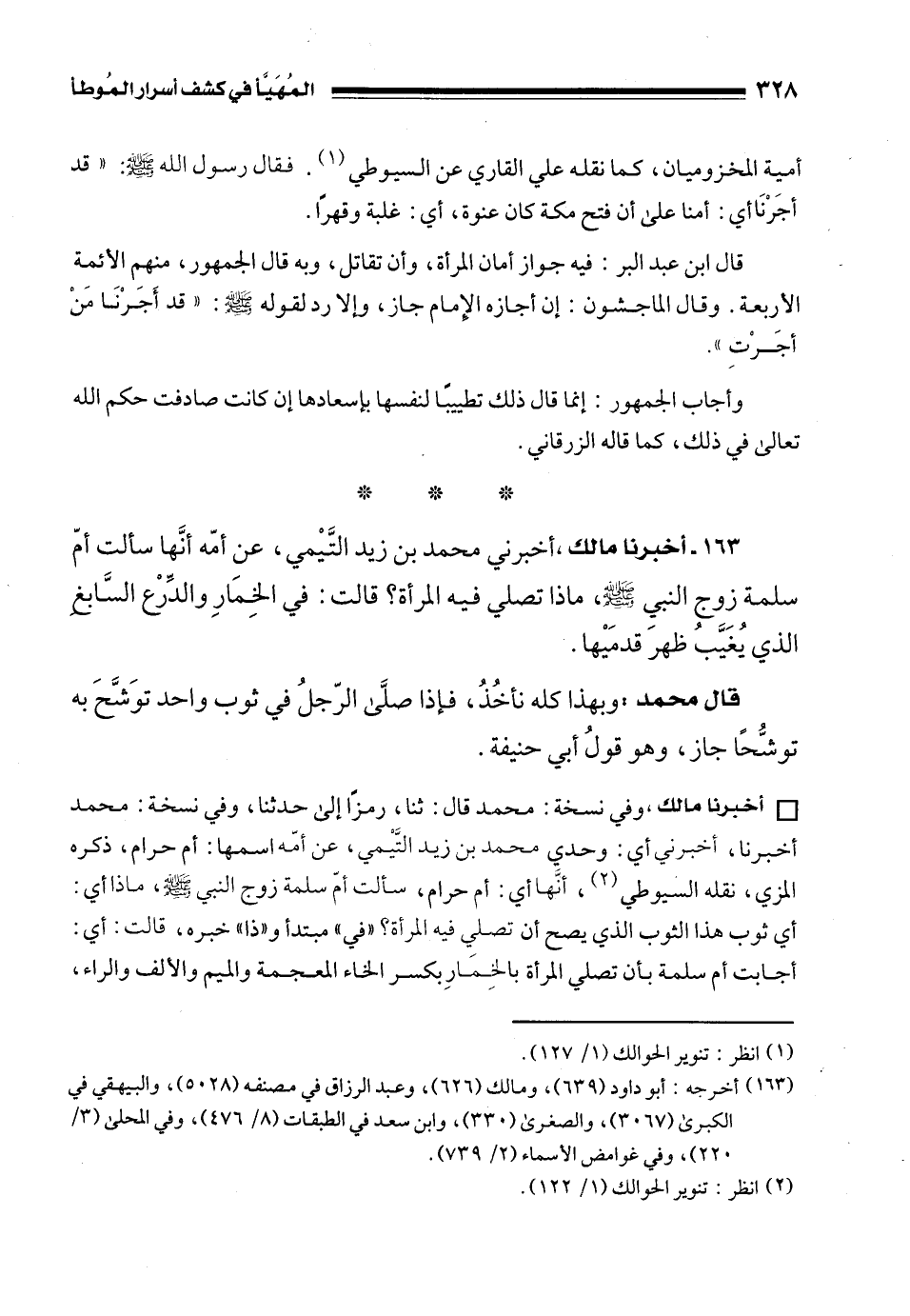 163 - أخبرنا مالك، أخبرني محمد بن زيد التَّيْمي، عن أمّه أنَّها سألت أمّ سلمة زوج النبي - صلى الله عليه وسلم -، ماذا تصلي فيه المرأة؟ قالت: في الخِمَارِ والدِّرْع السَّابغِ الذي يُغَيَّبُ ظهرَ قدمَيْها.