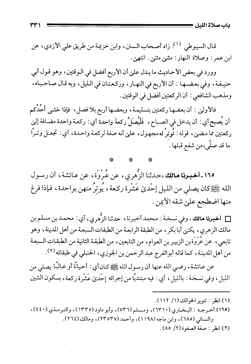 165 - أخبرنا مالك، حدثنا الزُّهري، عن عُرْوَة، عن عائشة، أن رسول الله - صلى الله عليه وسلم - كان يصلي من الليل إحْدى عَشْرة ركعة، يُوتِرُ منهن بواحدة، فإذا فرغ منها اضطجع على شقه الأيمن.