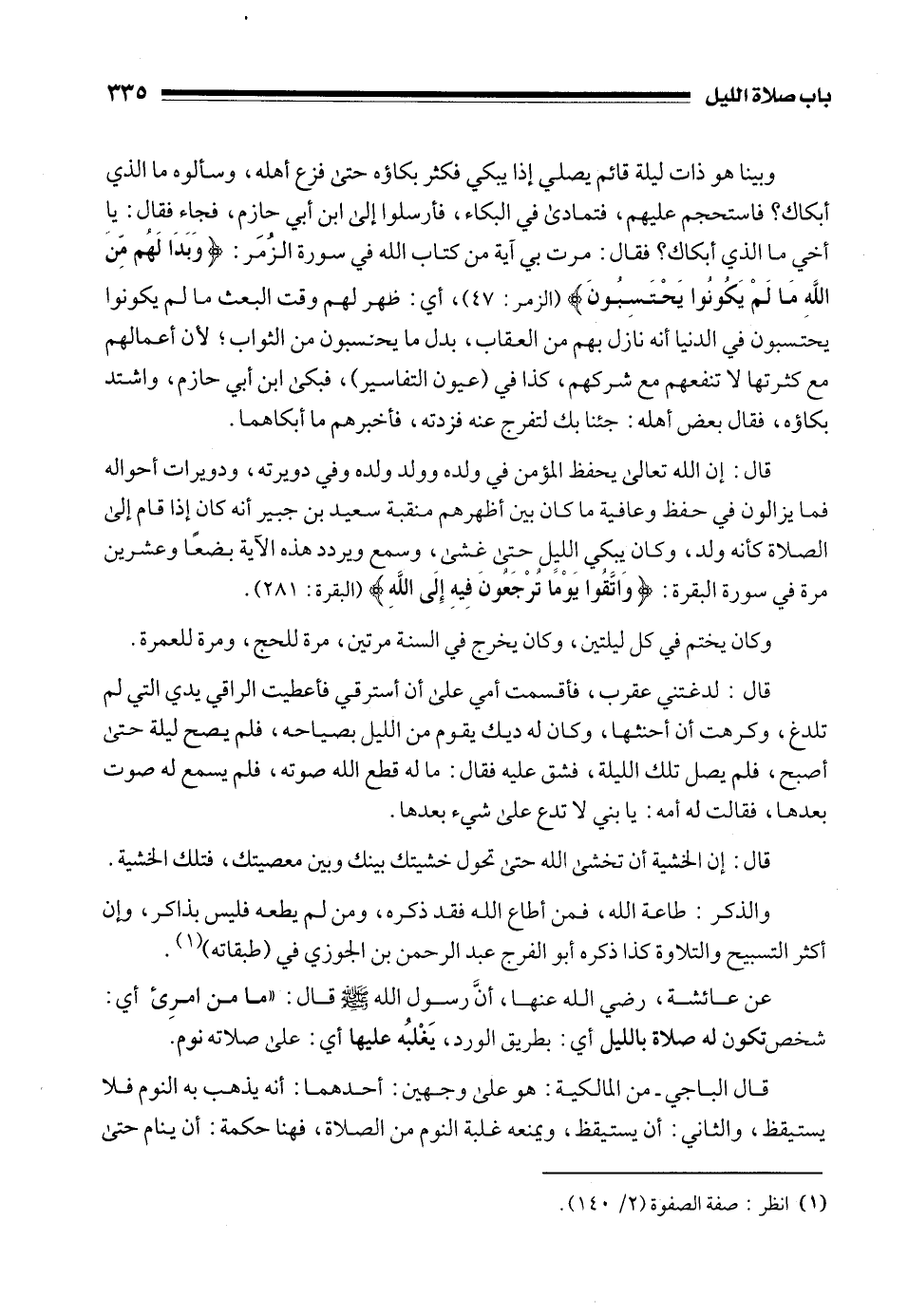 وبينا هو ذات ليلة قائم يصلي إذا يبكي فكثر بكاؤه حتى فزع أهله، وسألوه ما الذي أبكاك؟ فاستحجم عليهم، فتمادى في البكاء، فأرسلوا إلى ابن أبي حازم، فجاء فقال: يا أخي ما الذي أبكاك؟ فقال: مرت بي آية من كتاب الله في سورة الزُمَر: {وَبَدَا لَهُمْ مِنَ اللَّهِ مَا لَمْ يَكُونُوا يَحْتَسِبُونَ} [الزمر: 47]، أي: ظهر لهم وقت البعث ما لم يكونوا يحتسبون في الدنيا أنه نازل بهم من العقاب، بدل ما يحتسبون من الثواب؛ لأن أعمالهم مع كثرتها لا تنفعهم مع شركهم، كذا في (عيون التفاسير)، فبكى ابن أبي حازم، واشتد بكاؤه، فقال بعض أهله: جئنا بك لتفرج عنه فزدته، فأخبرهم ما أبكاهما.